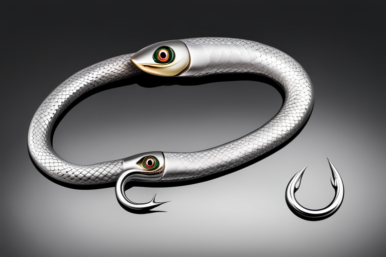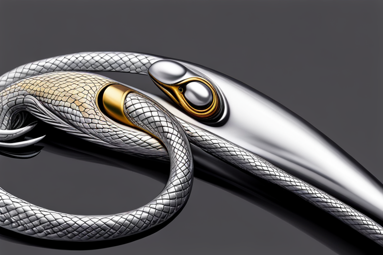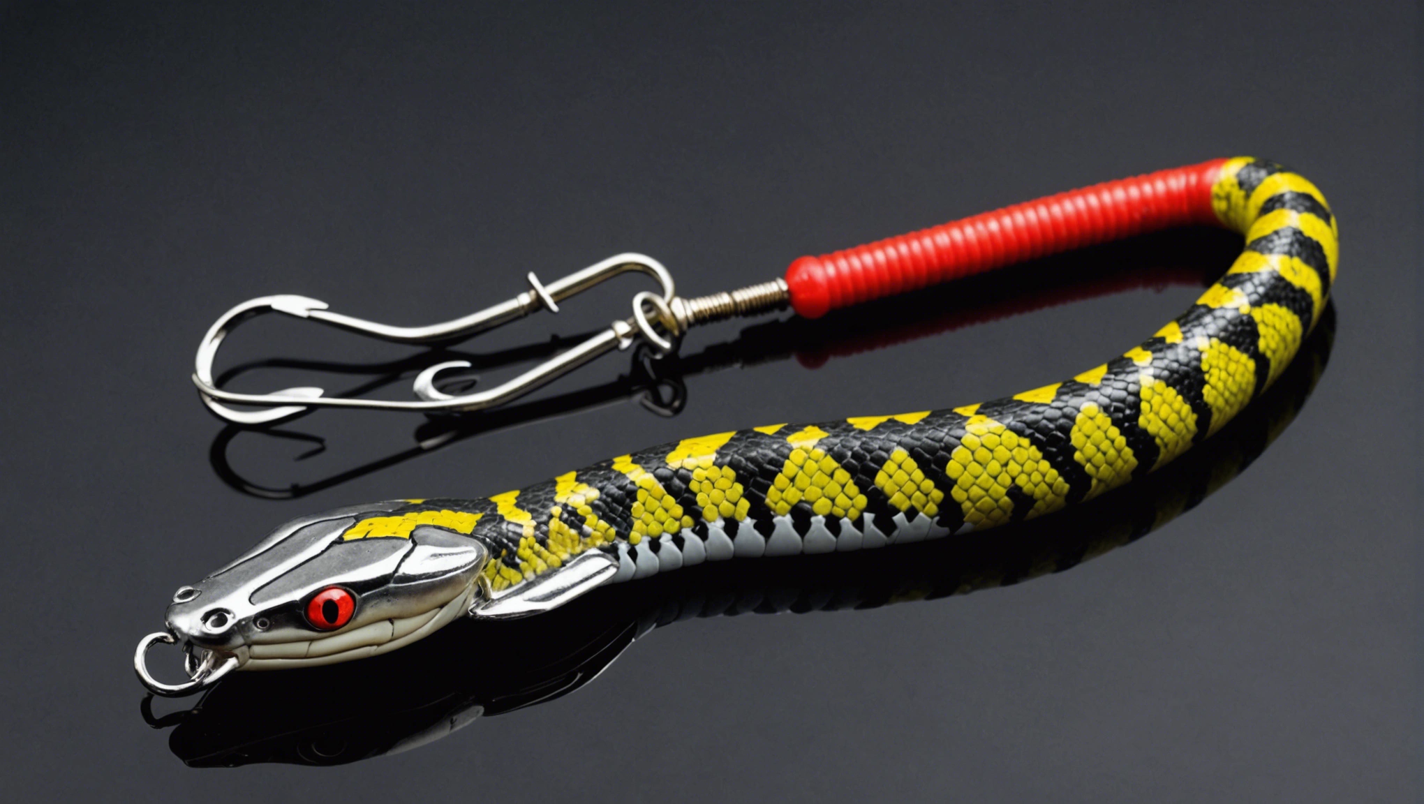 Stable Diffusion AI Prompt Fishing lure precisely mimics the exact shape and colors of a (((Silver Snake))). A panoramic studio shot of the highly detailed Silver colored ((Snake-shaped)) fishing lure with treble hooks designed to catch fish, centered product photography. A masterpiece product photo on a (black background).