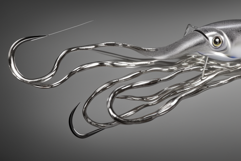 Stable Diffusion AI Prompt product photography of a fishing lure with hooks that looks like a Silver colored Squid!!!, (anatomically correct), futuristic, uhd, highly detailed, concept, product studio shot, panoramic shot, centered!!!, diffused lighting on a plain dark background, highly detailed, masterpiece, product photography by Jovana Rikalo