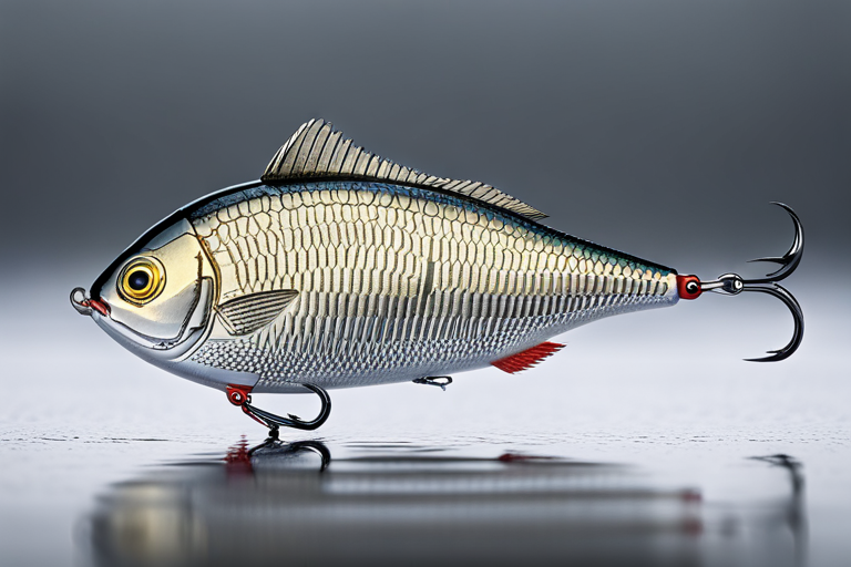 Stable Diffusion AI Prompt Fishing lure precisely mimics the exact shape and colors of a (((Silver Sunfish))). A panoramic studio shot of the highly detailed Silver colored ((Sunfish-shaped)) fishing lure with treble hooks designed to catch fish, centered product photography. A masterpiece product photo on a (black background).