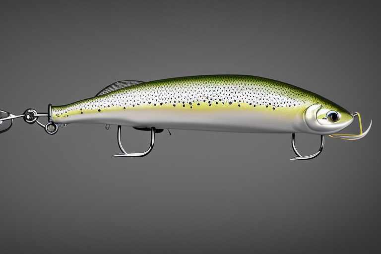 Stable Diffusion AI Prompt product photography of a fishing lure with hooks that looks like a Silver colored Trout!!!, (anatomically correct), futuristic, uhd, highly detailed, concept, product studio shot, panoramic shot, centered!!!, diffused lighting on a plain dark background, highly detailed, masterpiece, product photography by Jovana Rikalo