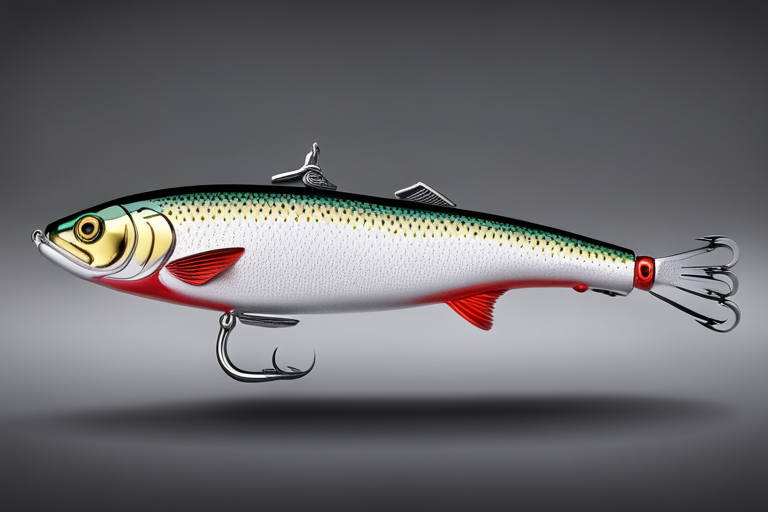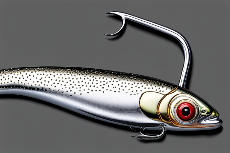 Stable Diffusion AI Prompt Fishing lure precisely mimics the exact shape and colors of a (((Silver Trout))). A panoramic studio shot of the highly detailed Silver colored ((Trout-shaped)) fishing lure with treble hooks designed to catch fish, centered product photography. A masterpiece product photo on a (black background).