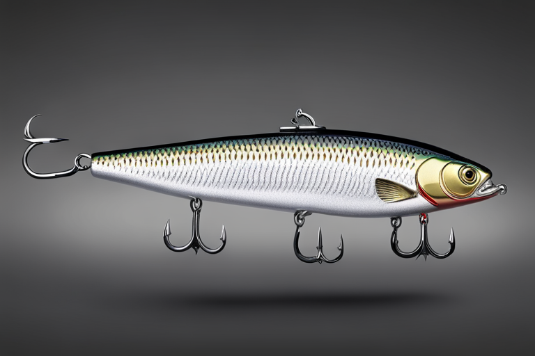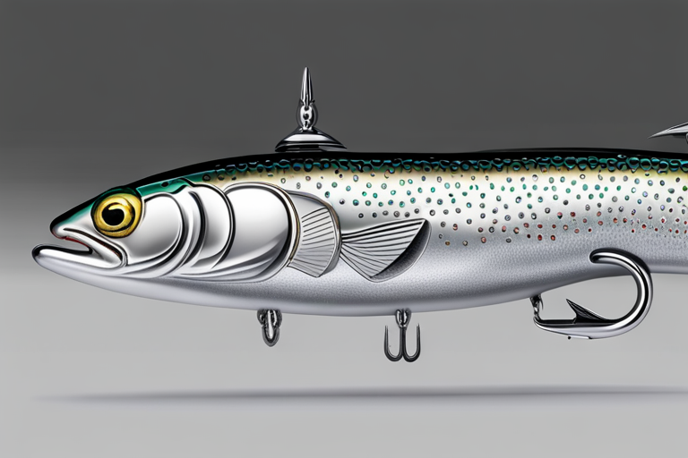 Stable Diffusion AI Prompt Fishing lure precisely mimics the exact shape and colors of a (((Silver Trout))). A panoramic studio shot of the highly detailed Silver colored ((Trout-shaped)) fishing lure with treble hooks designed to catch fish, centered product photography. A masterpiece product photo on a (black background).