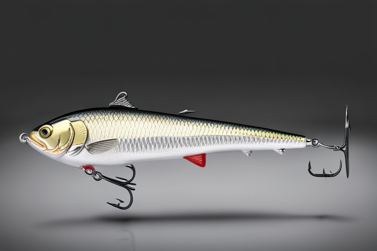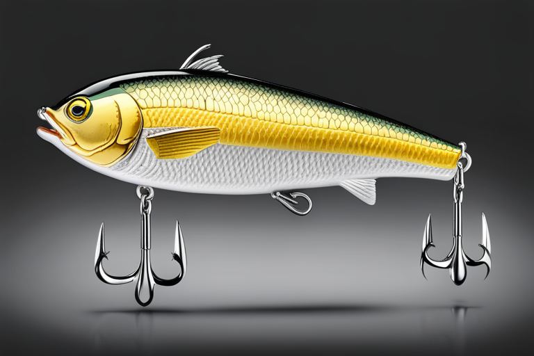 Stable Diffusion AI Prompt Fishing lure precisely mimics the exact shape and colors of a (((Silver Walleye ))). A panoramic studio shot of the highly detailed Silver colored ((Walleye -shaped)) fishing lure with treble hooks designed to catch fish, centered product photography. A masterpiece product photo on a (black background).
