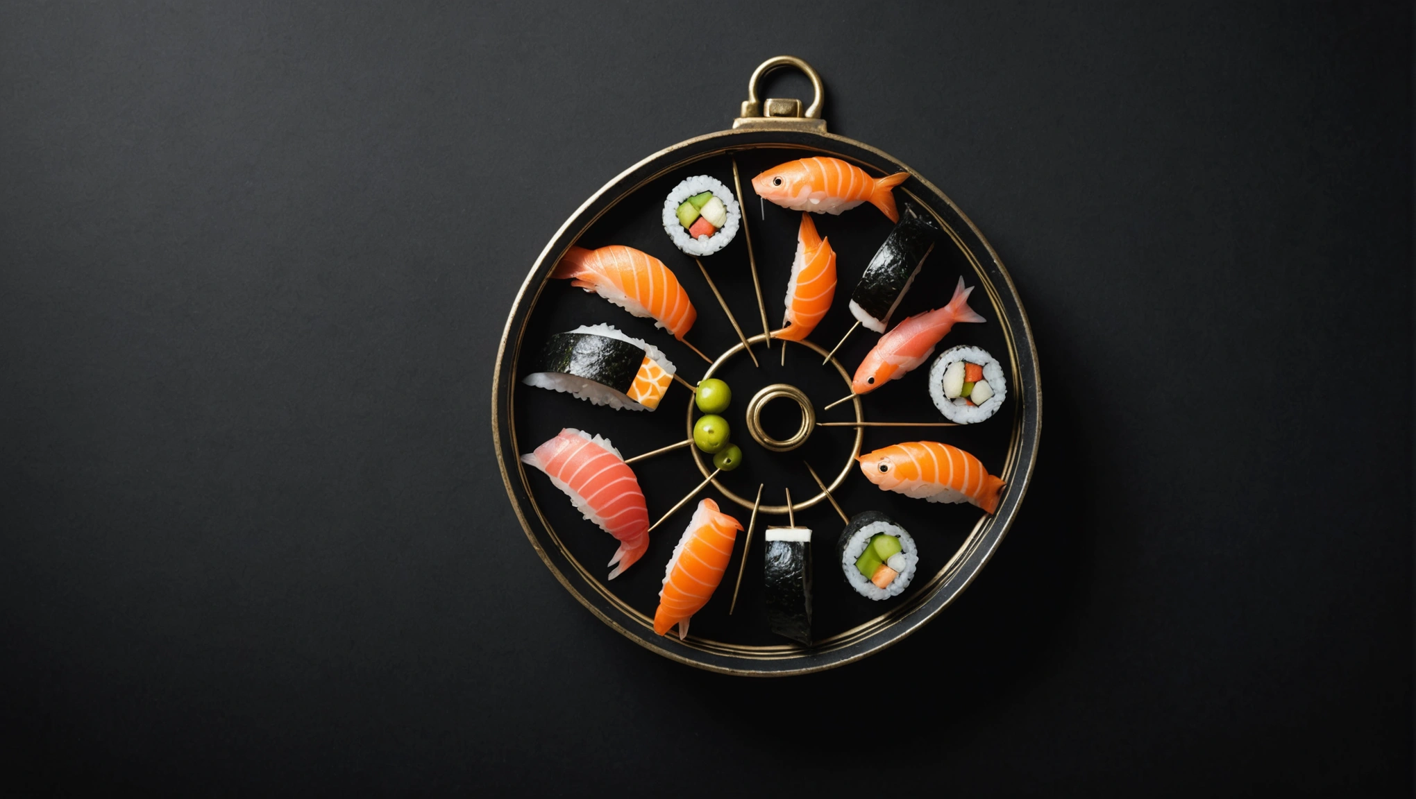 Fishing lure with fishing hooks like (((Sushi in a Lighthouse))). A studio shot masterpiece lure product photo centered on a (black background).