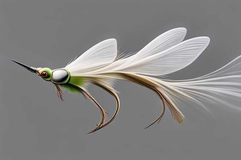 Stable Diffusion AI Prompt Fishing lure precisely mimics the exact shape and colors of a (((White Dragonfly))). A panoramic studio shot of the highly detailed White colored ((Dragonfly-shaped)) fishing lure with treble hooks designed to catch fish, centered product photography. A masterpiece product photo on a (black background).