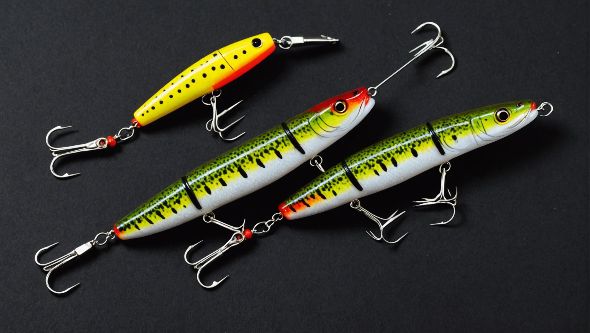 Fishing lure with fishing hooks like (((White Musky fishing lure))). A studio shot masterpiece lure product photo centered on a (black background).