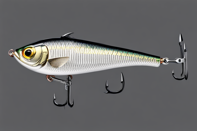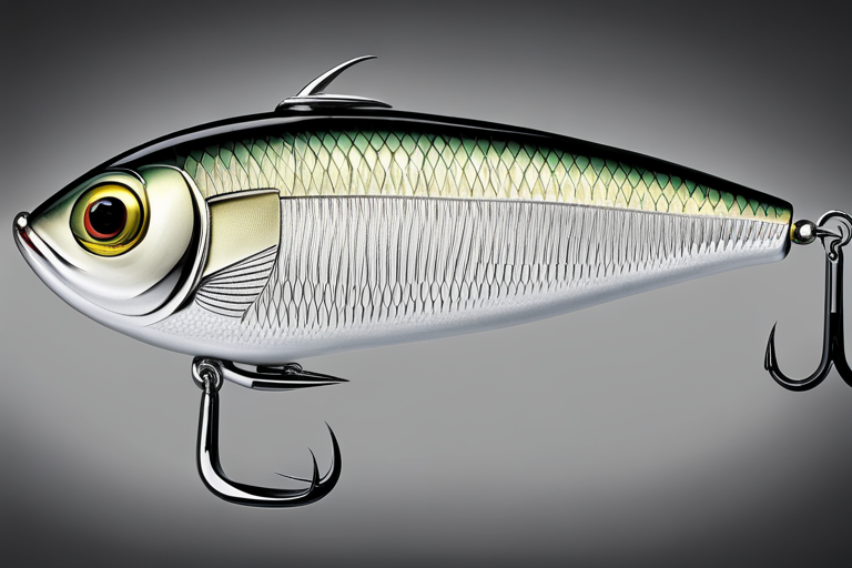 Stable Diffusion AI Prompt Fishing lure precisely mimics the exact shape and colors of a (((White Shad))). A panoramic studio shot of the highly detailed White colored ((Shad-shaped)) fishing lure with treble hooks designed to catch fish, centered product photography. A masterpiece product photo on a (black background).