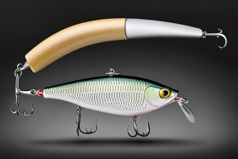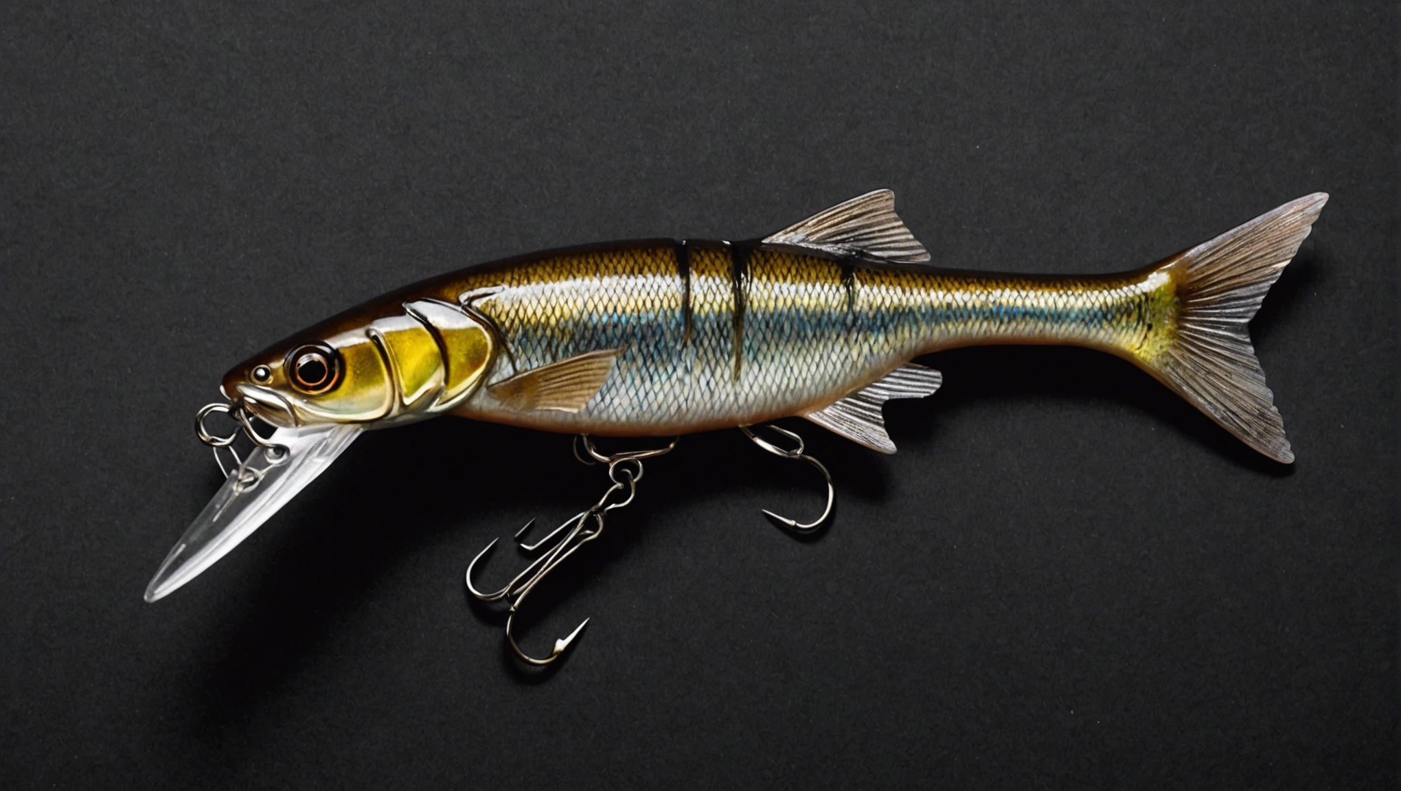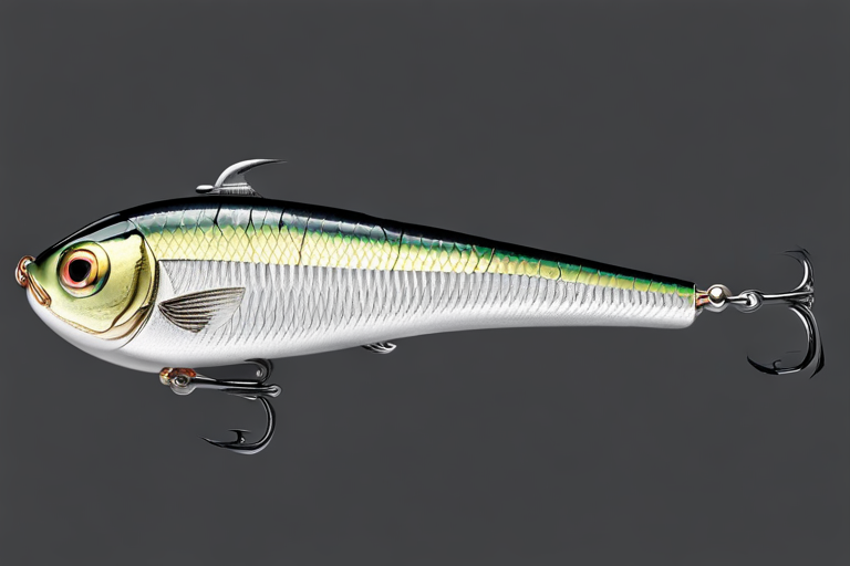 Stable Diffusion AI Prompt Fishing lure precisely mimics the exact shape and colors of a (((White Shad))). A panoramic studio shot of the highly detailed White colored ((Shad-shaped)) fishing lure with treble hooks designed to catch fish, centered product photography. A masterpiece product photo on a (black background).