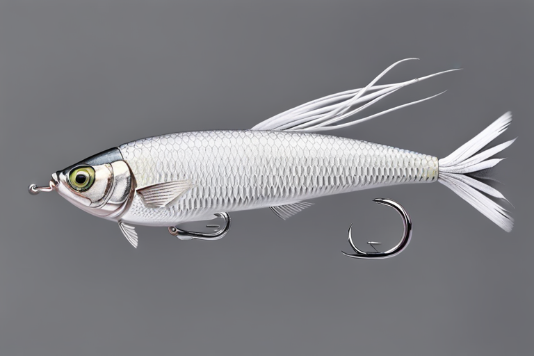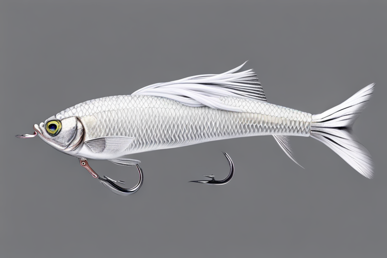 Stable Diffusion AI Prompt Fishing lure precisely mimics the exact shape and colors of a (((White Siamese Fish))). A panoramic studio shot of the highly detailed White colored ((Siamese Fish-shaped)) fishing lure with treble hooks designed to catch fish, centered product photography. A masterpiece product photo on a (black background).