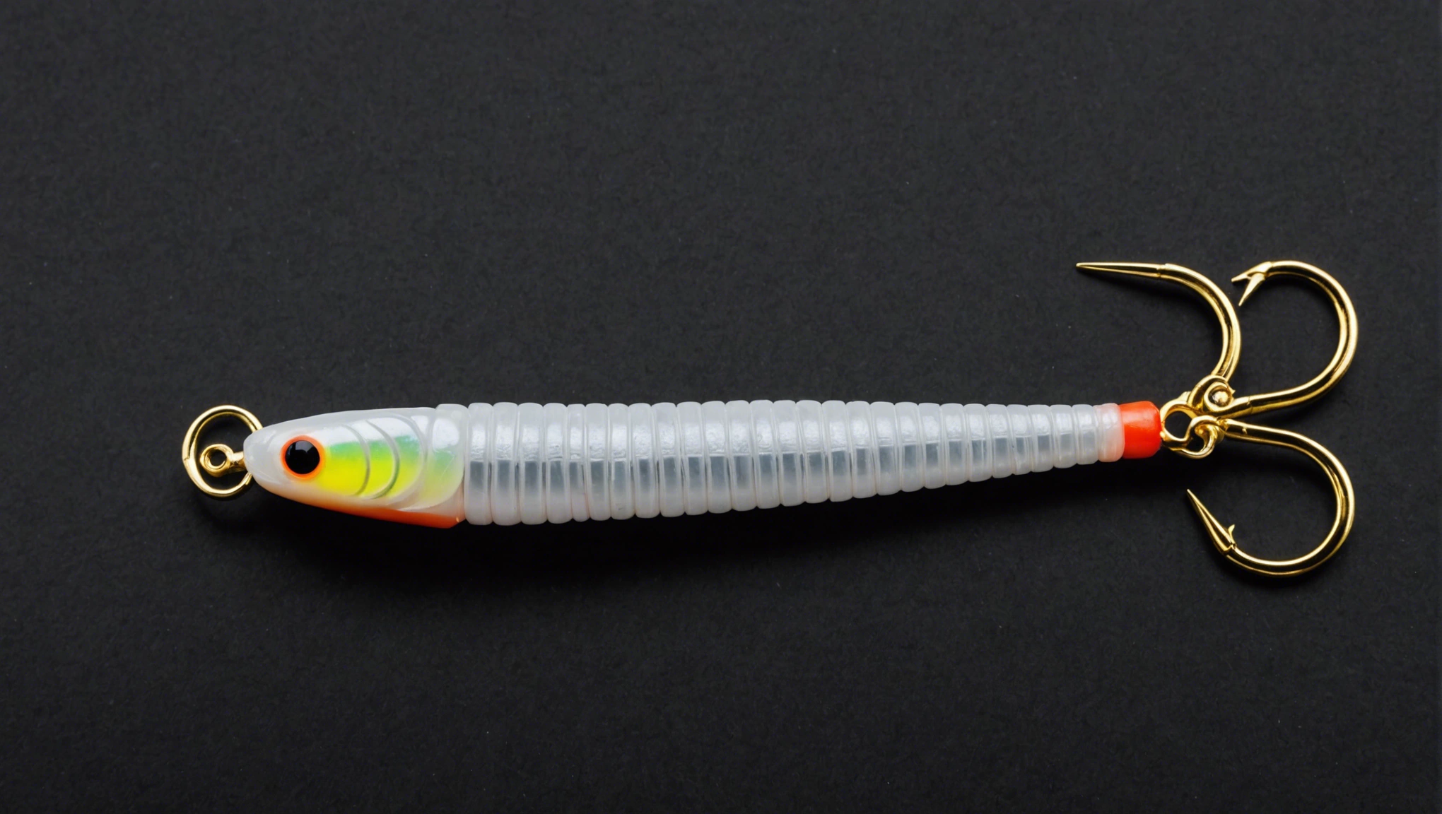 Fishing lure with fishing hooks like (((White Worm))). A studio shot masterpiece lure product photo centered on a (black background).
