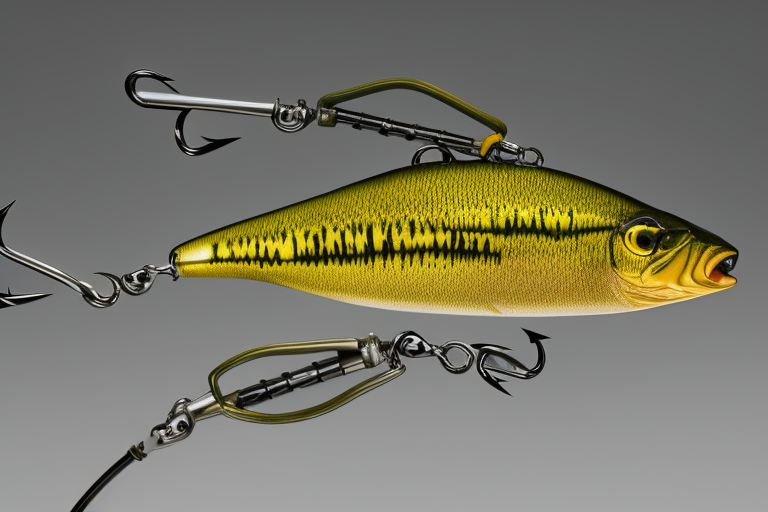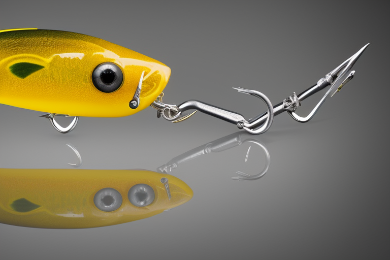 Stable Diffusion AI Prompt product photography of a fishing lure with hooks that looks like a Yellow colored Bass!!!, (anatomically correct), futuristic, uhd, highly detailed, concept, product studio shot, panoramic shot, centered!!!, diffused lighting on a plain dark background, highly detailed, masterpiece, product photography by Wlop and Jovana Rikalo