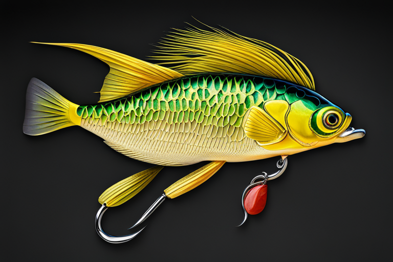 Stable Diffusion AI Prompt Fishing lure precisely mimics the exact shape and colors of a (((Yellow Crappie))). A panoramic studio shot of the highly detailed Yellow colored ((Crappie-shaped)) fishing lure with treble hooks designed to catch fish, centered product photography. A masterpiece product photo on a (black background).