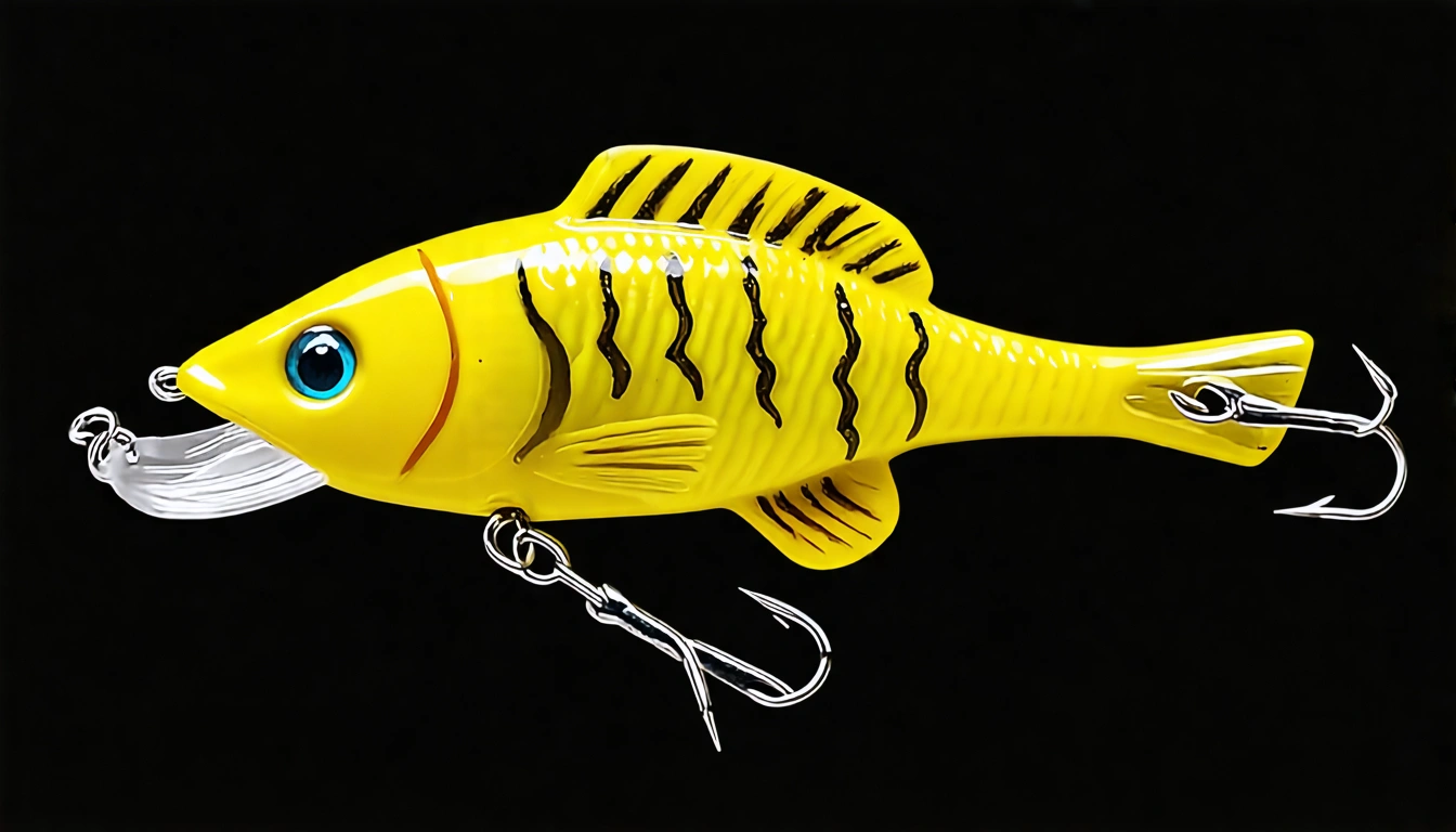Fishing lure with fishing hooks like (((Yellow Crappie))). A studio shot masterpiece lure product photo centered on a (black background).