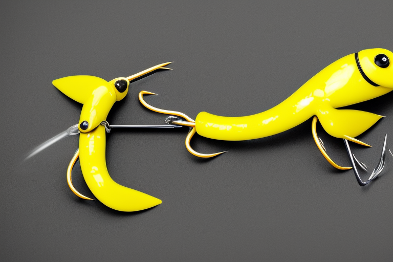 Stable Diffusion AI Prompt product photography of a fishing lure with hooks that looks like a Yellow colored Grub!!!, (anatomically correct), futuristic, uhd, highly detailed, concept, product studio shot, panoramic shot, centered!!!, diffused lighting on a plain dark background, highly detailed, masterpiece, product photography by Wlop and Jovana Rikalo