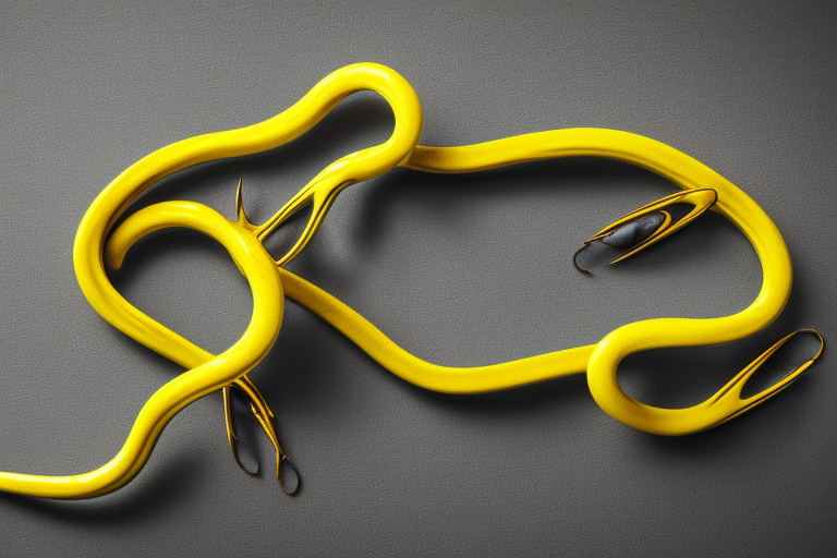 Stable Diffusion AI Prompt product photography of a fishing lure with hooks that looks like a Yellow colored Snake!!!, (anatomically correct), futuristic, uhd, highly detailed, concept, product studio shot, panoramic shot, centered!!!, diffused lighting on a plain dark background, highly detailed, masterpiece, product photography by Jovana Rikalo