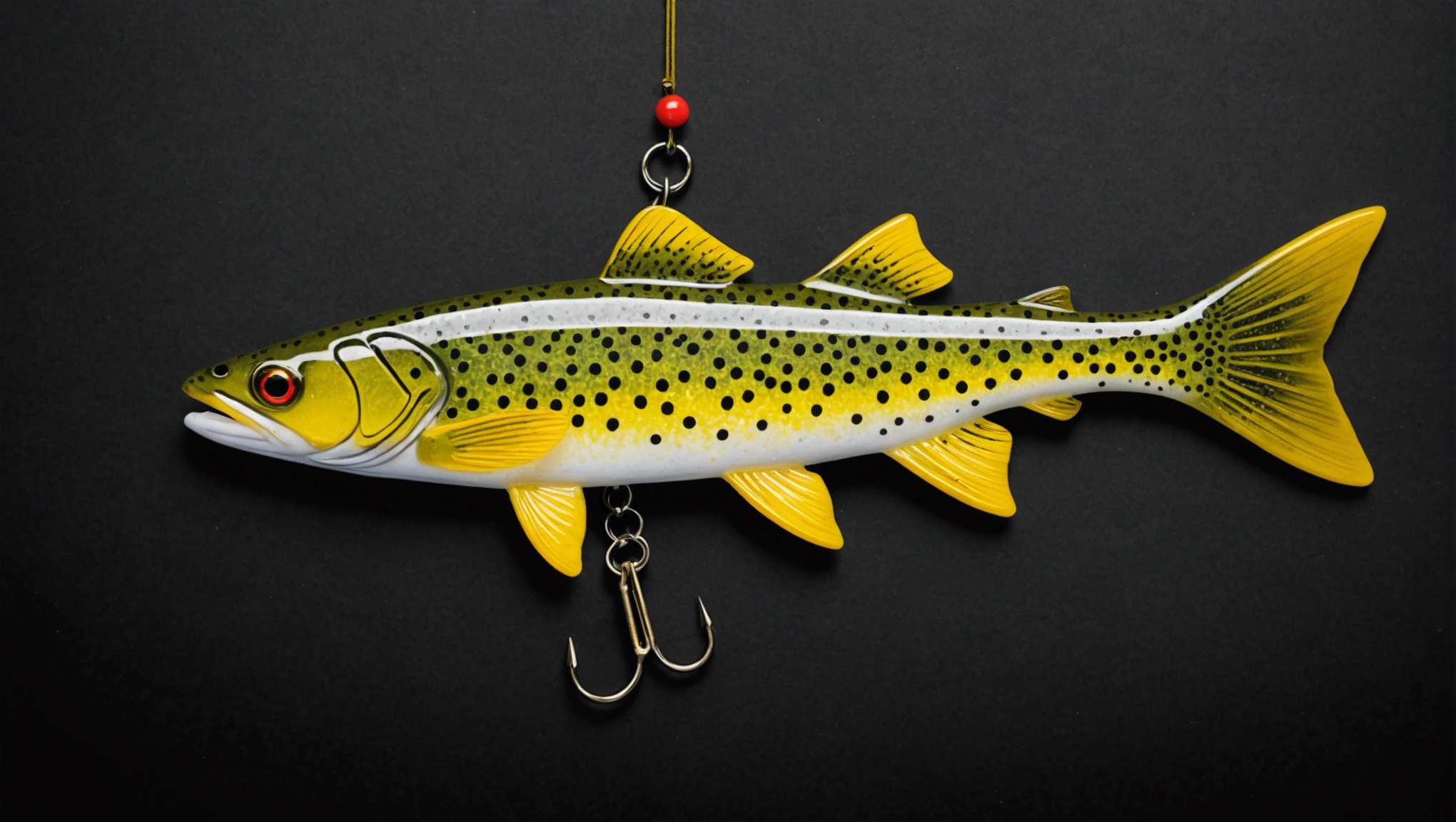 Fishing lure with fishing hooks like (((Yellow Speckled sea trout ))). A studio shot masterpiece lure product photo centered on a (black background).