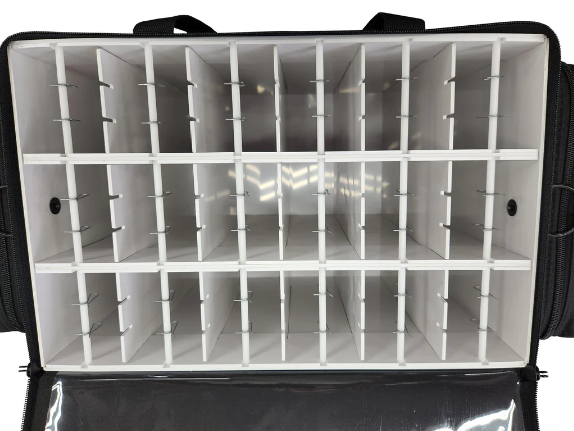 This Is a Pre Order. Warning any baits or other products bought with this product from our website will be shipped separately. The last day for this pre order is September 30th. Please allow 2 to 3 weeks for production/shipping NEW FOR 2022: Two sizes available and redesigned interior! The Ultimate Swimbait Tackle Storage! Keep those expensive baits protected! Separate compartments to hang swim baits with individual rods and clips. Comes with 2 clips per compartment. More can be purchased if needed. Front pockets for tools and zippered side pockets for storage. Heavy duty ABS wrapped with foam lined polyester material. Webbing handles and shoulder strap. Floats when loaded! (when fully zipped) Made in the USA Lifetime Warranty A047-S Outside Case Dimensions: 12.5” L x 12.5” W x 12” H A047-L Outside Case Dimensions: 19" L x 12.5" W x 12" H