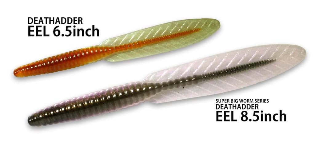 tail wave motion. Immediately after its release, the super big worm series “Death Adder Eel 8.5 inch” hit the record class of over 8kg and Nanamaru, and showed off its power. Even in wild ponds and small fields, the tail creates a strong backward wave and a spontaneous action with a sense of life. Widely compatible with various rigs such as custom chatters and jigs. DEATHADDER EEL SIZE:6.5inch(5/pac) Recommended hooks: offset hooks #1/0 to #4/0 2014.3 release. End of production April 1, 2022 BODY FORM&MATERIAL The hand-powdered body has high buoyancy and flexibility, and is a non-salt soft material with high tensile strength that reduces tearing and breakage. TAIL The pillar that runs through the ultra-thin wide tail like a spine plays the role of a stabilizer, and when it lifts and falls or falls down, it reliably grabs the water and shows a high appeal power that creates a strong backward wave without missing it. In addition, the wide tail, which has been kept as thin as possible, is combined with the softness of hand-powered, and the way it moves even with a slight current is like a fish moving its fins, attracting big bass with a lively action. I will put it on. MATCHED RIG The color of the posted image may look slightly different from the actual product depending on the shooting environment and the computer or mobile phone carrier you are viewing. Please note. Even if the recommended hooks are the same size, the hook dimensions differ depending on the hook manufacturer, so please select according to the size and shape of the worm.