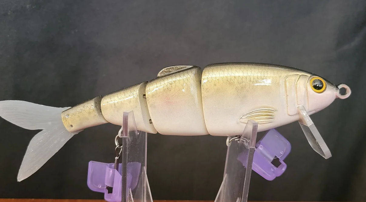 - piece billed swimbait combination floatercrankdown style baitdivesdepthsftdeeplong castsfaster reeling cranking varied retrieves makepowerfully attractive baitbig fish soft rubber tailgreat swimming actionswiveling hook hangersfish pinned paintedtrippplecustoms length weight oz hand poured durable flexible rubber tailmouth gillfin gamakatsu hookssplit rings changing hooksplit ring sizeschange floating capabilties