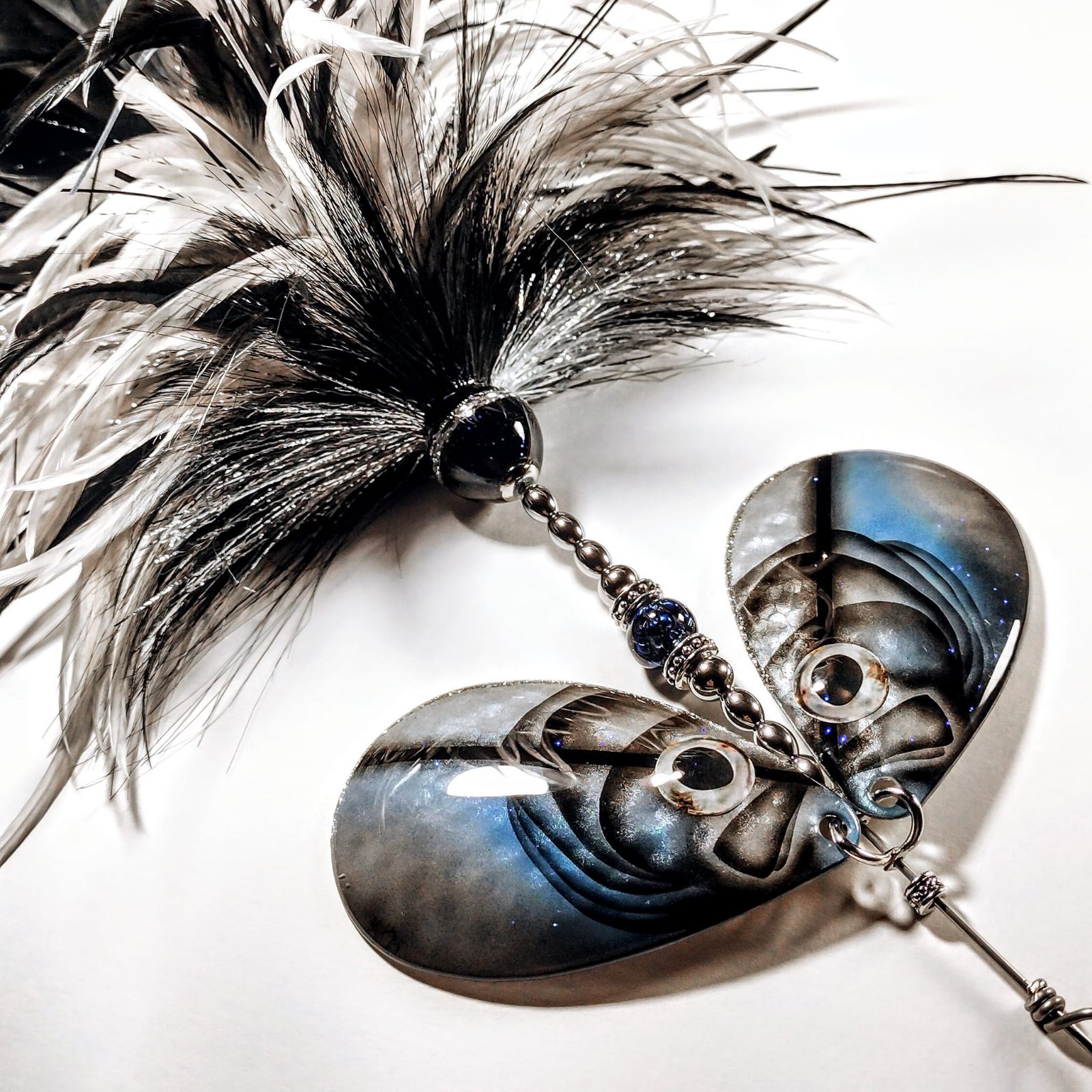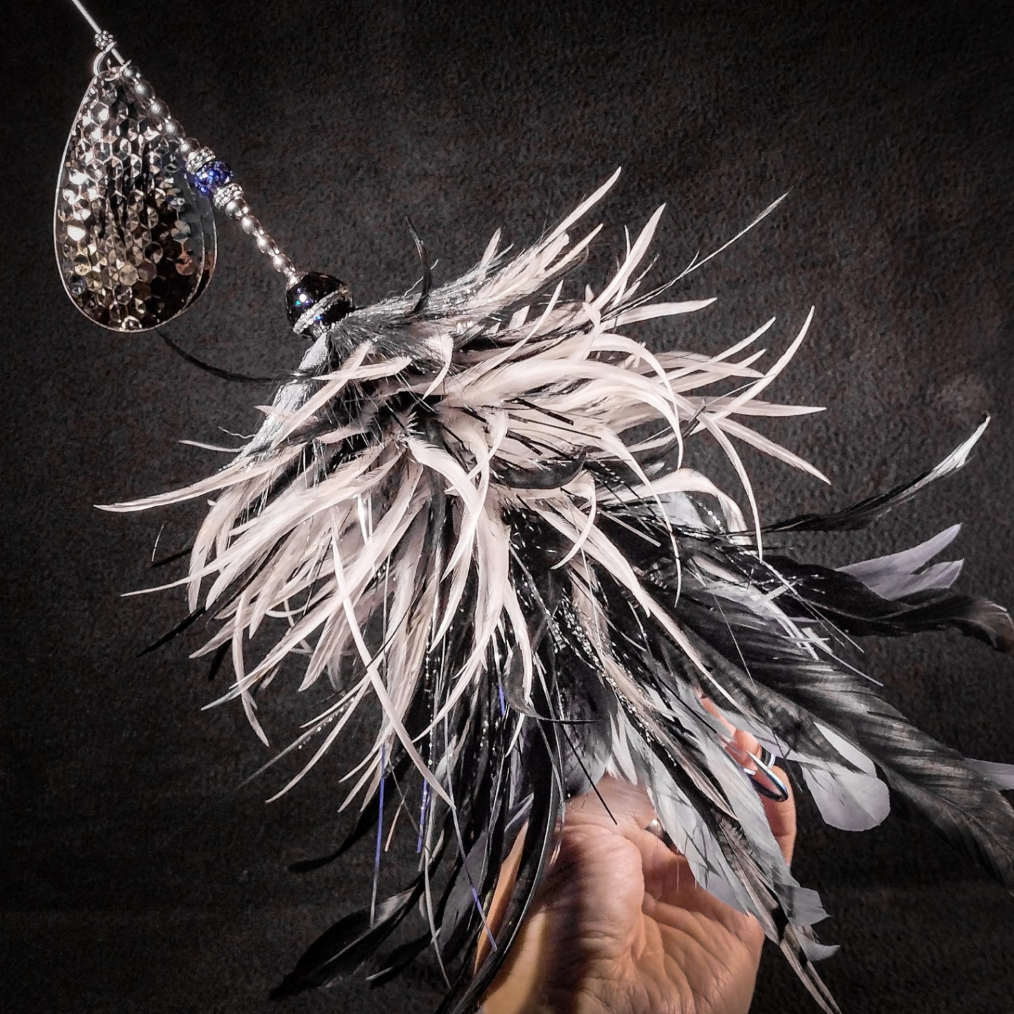 14" long. 10"wide. 6 ounces. Mag hex 12s. Hd built Double hook harness. Rebuild-able direct to wire construction. Stainless oval beads. Some hand decorated. Decorated matching hooks by #ChaosTackle .