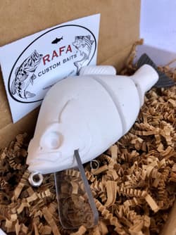 7 inch Blue Gill Model Wake Bait. Bait is primed and ready for your custom paint! Comes with Eye Hooks and Lip. **NOTE** Eyes hooks and lip are not already on the bait. 5 min epoxy recommended for lip. Body Made From Resin Weight: 4.34 oz