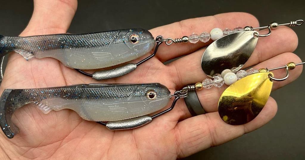 Here’s a couple smoky Shad 3.5” Puds with detachable “Dozer Blade” wire forms, pre-rigged on my modified, weighted VMC Special Bend 6/0, 5/16oz, Swimbait hooks. For those unfamiliar, a “dozer blade” is basically the single or double blade wire form of an inline connected to a Swimbait instead of a bucktail. In the muskie world the swimbaits are huge as are the Dozer Blades and wire forms. A slightly downsized version (size 6 Indiana Blades) is perfect for bass, stripers, and wipers. Each wire form is connected via split ring, easily disconnected if you want to fish the Pud with just the weighted hook.