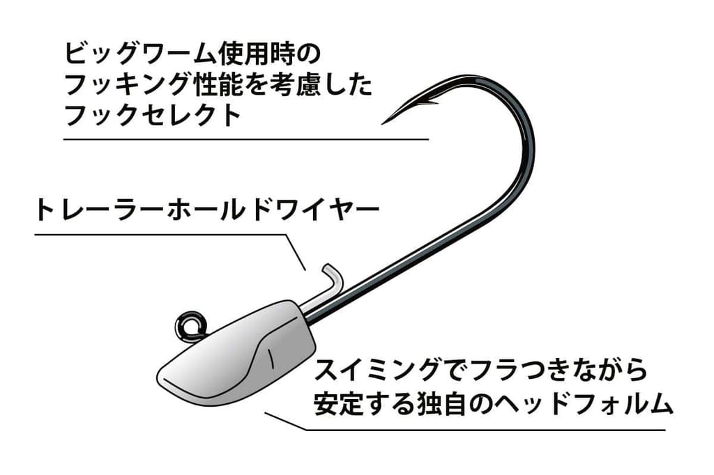 A shape that pursues the function of catching big bass. The "swimming jig head", which pursues a head shape that sharply cuts the water flow and an eye position that maintains a stable swim balance, is a suspending big fish that does not use its mouth for hard bait, and a schooler type big fish that is highly migratory. It is a jig head for big bass to capture with a jig head swim. Considering the use of big worms such as death adders, the tough Ex. sharp, wide gap hooks and trailer hold wires that keep the worms in place even with a full swing are specially designed based on the concept of "catch if you hang". We respond to the severe demands of big bass hunters who do not want to miss a momentary chance. SWIMMING JIG HEAD HEAD WEIGHT: 1/16oz, 1/8oz, 1/4oz, 3/8oz HOOK SIZE: #3/0 (only 3/8oz is #4/0) 4/pack ¥528 (tax excluded ¥480) 2005.4 release. The unique head form that stabilizes while it wobbles in swimming creates a tight rolling action and is highly compatible with mid-level capture. The 1/4 to 3/8 oz head also works great in combination with the B custom jig spinner.