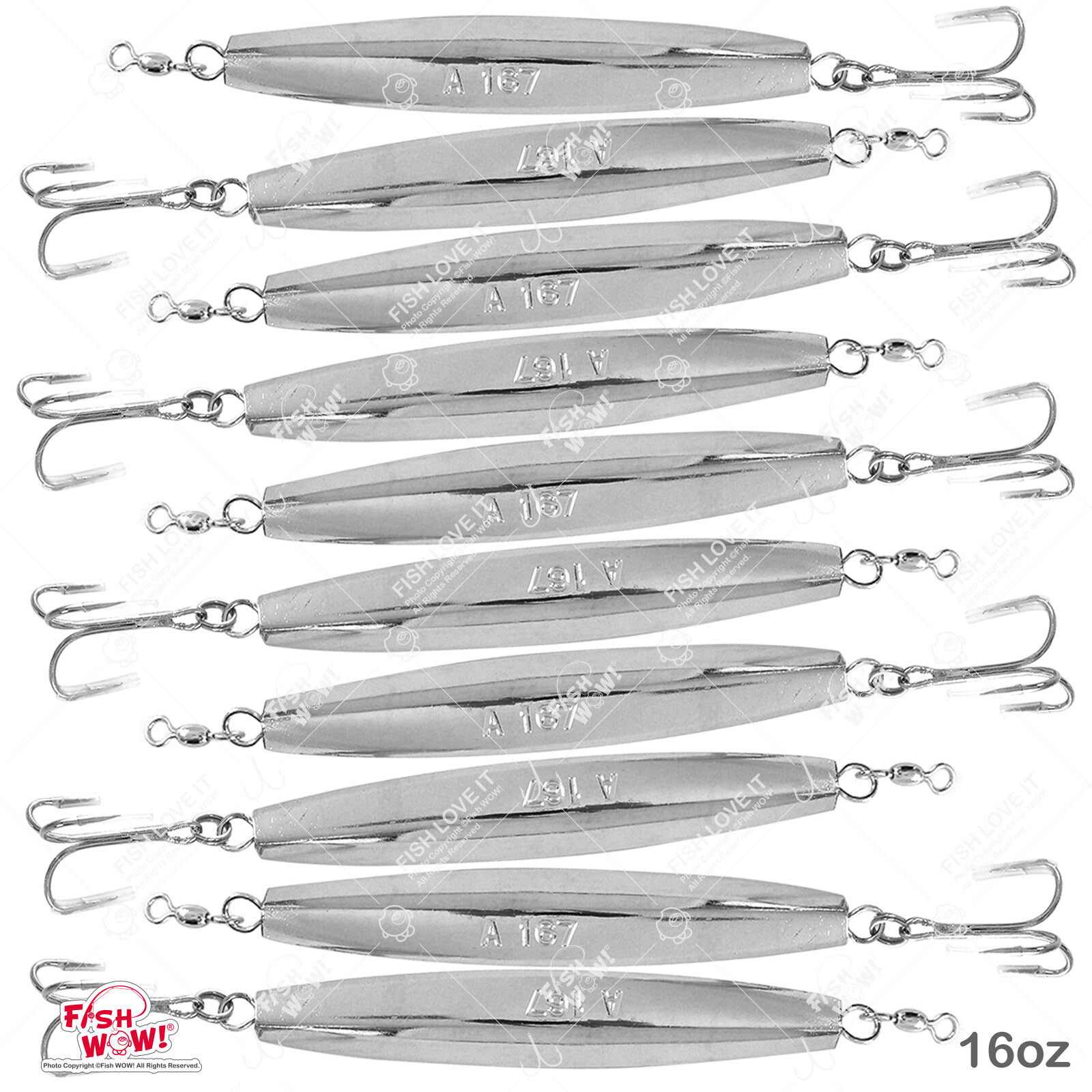 PLEASE VISIT OUR STORE AT HTTP://STORES.EBAY.COM/FISHWOW TO FIND MORE EXCITED DEALS!! DESCRIPTION Item Name Fish WOW! Fishing Diamond Jig w/ a Treble Hook Bait Size Weight in Ounces Hook Size Length (included hook & ring) Length (body) 16oz 7/0 11 in 7.5 in Included Total is 10 pieces. Condition * New in the pack. * Brand Name: Fish WOW!® * This diamond shape design drops vertically at high speeds and gets you right on top of the fish even with a heavy drift. * Cast them or troll them or bounce them off the bottom, they work great on fish like Codfish, Bluefish and Striped Bass. * Diamond jigs tame a variety of salt water brutes. * Great for Jigging, Casting and Ripping. * Please check the item carefully you will receive what you see on the picture. * Picture shows the actual goods. What you see is what you get. Color Please see the images. (*Please note that the colors may be slightly different from the originals, depending on the settings of your monitor.) Shipping * We're U.S. Seller. * Ship to USA only. * Your item will ship within 24 hours (Mon-Fri) of receiving cleared payment. * Buyer responsible for extra shipping fee of the wrong address. * Delivery may take up to 1-10 days depending on demand and location. * Payment made on Saturday, Sunday or public holiday, package will be shipped out on next Monday or next business day (if Monday is holiday). * LOST or Stolen Orders (after delivery): We are not responsible for any order lost or stolen after delivery. Any such claim should be taken up with your local postal service or carrier. * International Buyers – Please Note: * Import duties, taxes, and charges are not included in the item price or shipping cost. These charges are the buyer's responsibility. * Please check with your country's customs office to determine what these additional costs will be prior to bidding or buying. Payment * Please make payment within 3 days after the auction or purchase. * We use eBay Payment system. Please contact eBay when you have questions or trouble. * eBay will calculate, collect, and remit sales tax by your state law. * Please double check your shipping address when you check out. Feedback * We strive to deliver 5-star customer service. If you are satisfied with the product you received, please leave us positive feedback with 5 stars. * Your feedback is very important to us. We must do our best to strive for your 5 star Feedback. Before you intend to leave a neutral or negative feedback, please give us a chance to get a solution for you. We must work hard to make sure EVERY CUSTOMER 100% SATISFIED and resolve any problem for you. * If we make a mistake in the shipping process such as wrong item, damaged item or lost package, we will either full refund both the purchase price and shipping cost or resend a new package again. We are committed to your full satisfaction. Return policy * Please contact us first before returning your items. * If you are not satisfied, please contact us within 3 days of receipt for refund. * Buyer pays shipping fee to return item within 14 days after receipt of shipment. Refund will be processed as soon as the item is received. * Any request to return an item for a refund will be charge a minimum restocking fee of 20% of the purchase price paid, plus any applicable sales tax. * Returns must include all original items undamaged, brand new, unused, all tags attached in the same condition it was received, and all original packaging. * Buyer is responsible for all shipping fees on returns. * Shipping charges are non-refundable. Refund given on merchandise only. * When shipping is included in the product price, such as marked "Free Shipping", actual shipping costs will be deducted from your refund. * Wrap the package carefully. All returned products must be in their original condition and packaging. * Once your package has been received and inspected, a refund will be issued to you for the price of the item(s) being returned. * Please save your return tracking number, and email it to us. We need this in case there are any issues during transit. * Please do not request a charge back of your purchase from your credit card company while waiting for us to completely process your request. Refund processing involves several steps, some that we cannot control, so please be patient while awaiting the credit for the original purchase to appear via the payment method that you used. * If you have any questions about whether a product can be returned, please call us before ordering. Contact us * Please contact us via eBay message. We will normally response to your email within 24 hours. If you do not receive our responds after 24 hours, please send the message to us again.