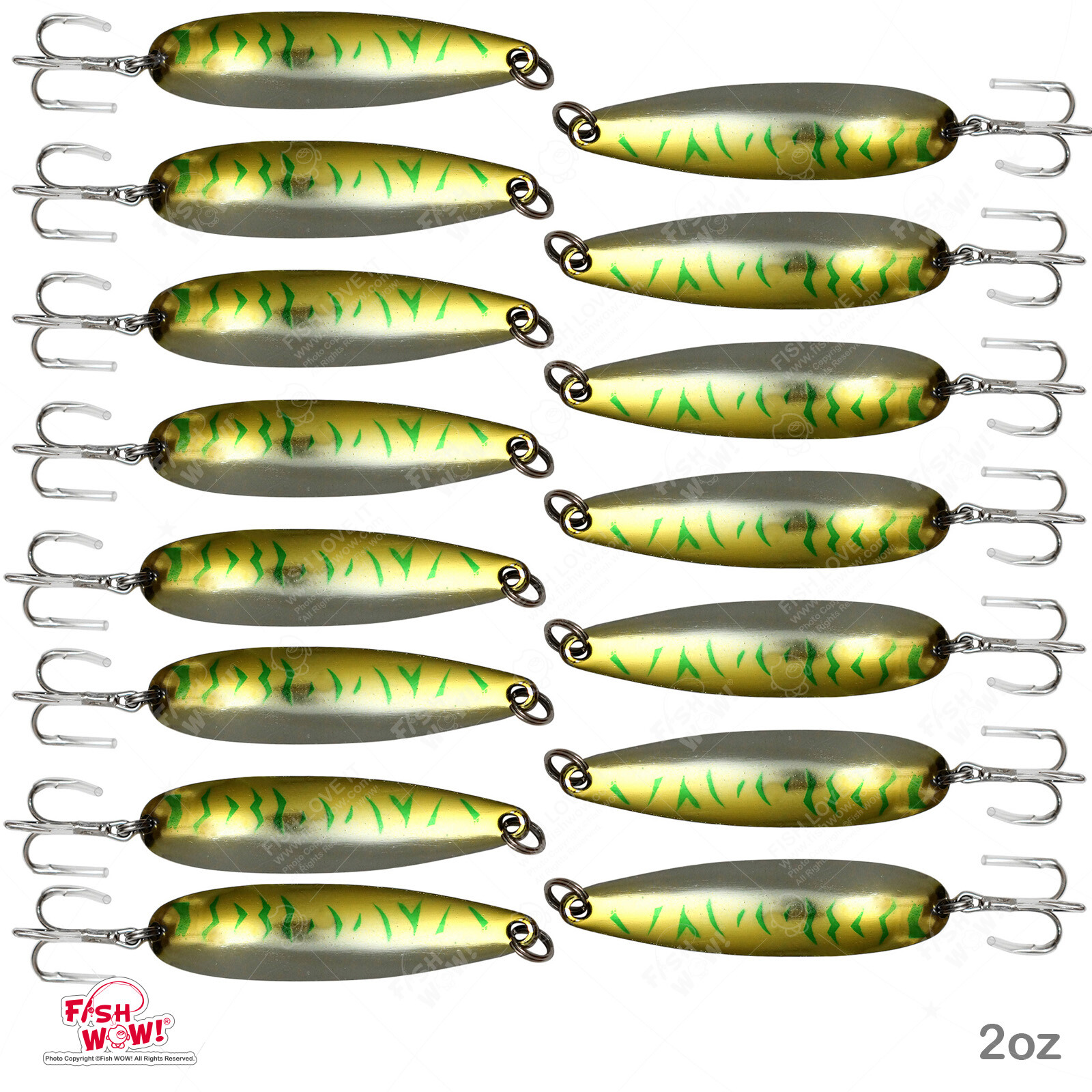 PLEASE VISIT OUR STORE AT HTTP://STORES.EBAY.COM/FISHWOW TO FIND MORE EXCITED DEALS!! DESCRIPTION Item Name Fish WOW!® Fishing Metal Spoon jig with a Treble Hook (JIGGING - TROLLING - CASTING - ICE FISHING - SALTWATER OR FRESHWATER) Size Weight in Ounces Length (included hook & ring) Length (body) 2oz 6 in 4.25 in Included TOTAL IS 15 PIECES. Condition * New in the pack. * Brand Name: Fish WOW!® * With a 3x Treble Hook. * Versatile, jigging, casting or trolling. * Multi-species, freshwater or saltwater. * The long standing popularity of spoons results from ease of use as a fish usually will hook itself when it grabs a spoon. * Spoon jigs work best for larger predators such as northern pike, largemouth bass, muskies, walleye, salmon, trout and many others. * Please check the item carefully you will receive what you see on the picture. * Picture shows the actual goods. What you see is what you get. Color Please see the images. (*Please note that the colors may be slightly different from the originals, depending on the settings of your monitor.) Shipping * We're U.S. Seller. * Ship to USA only. * Your item will ship within 24 hours (Mon-Fri) of receiving cleared payment. * Buyer responsible for extra shipping fee of the wrong address. * Delivery may take up to 1-10 days depending on demand and location. * Payment made on Saturday, Sunday or public holiday, package will be shipped out on next Monday or next business day (if Monday is holiday). * LOST or Stolen Orders (after delivery): We are not responsible for any order lost or stolen after delivery. Any such claim should be taken up with your local postal service or carrier. * International Buyers – Please Note: * Import duties, taxes, and charges are not included in the item price or shipping cost. These charges are the buyer's responsibility. * Please check with your country's customs office to determine what these additional costs will be prior to bidding or buying. Payment * Please make payment within 3 days after the auction or purchase. * We use eBay Payment system. Please contact eBay when you have questions or trouble. * eBay will calculate, collect, and remit sales tax by your state law. * Please double check your shipping address when you check out. Feedback * We strive to deliver 5-star customer service. If you are satisfied with the product you received, please leave us positive feedback with 5 stars. * Your feedback is very important to us. We must do our best to strive for your 5 star Feedback. Before you intend to leave a neutral or negative feedback, please give us a chance to get a solution for you. We must work hard to make sure EVERY CUSTOMER 100% SATISFIED and resolve any problem for you. * If we make a mistake in the shipping process such as wrong item, damaged item or lost package, we will either full refund both the purchase price and shipping cost or resend a new package again. We are committed to your full satisfaction. Return policy * Please contact us first before returning your items. * If you are not satisfied, please contact us within 3 days of receipt for refund. * Buyer pays shipping fee to return item within 14 days after receipt of shipment. Refund will be processed as soon as the item is received. * Any request to return an item for a refund will be charge a minimum restocking fee of 20% of the purchase price paid, plus any applicable sales tax. * Returns must include all original items undamaged, brand new, unused, all tags attached in the same condition it was received, and all original packaging. * Buyer is responsible for all shipping fees on returns. * Shipping charges are non-refundable. Refund given on merchandise only. * When shipping is included in the product price, such as marked "Free Shipping", actual shipping costs will be deducted from your refund. * Wrap the package carefully. All returned products must be in their original condition and packaging. * Once your package has been received and inspected, a refund will be issued to you for the price of the item(s) being returned. * Please save your return tracking number, and email it to us. We need this in case there are any issues during transit. * Please do not request a charge back of your purchase from your credit card company while waiting for us to completely process your request. Refund processing involves several steps, some that we cannot control, so please be patient while awaiting the credit for the original purchase to appear via the payment method that you used. * If you have any questions about whether a product can be returned, please call us before ordering. Contact us * Please contact us via eBay message. We will normally response to your email within 24 hours. If you do not receive our responds after 24 hours, please send the message to us again.