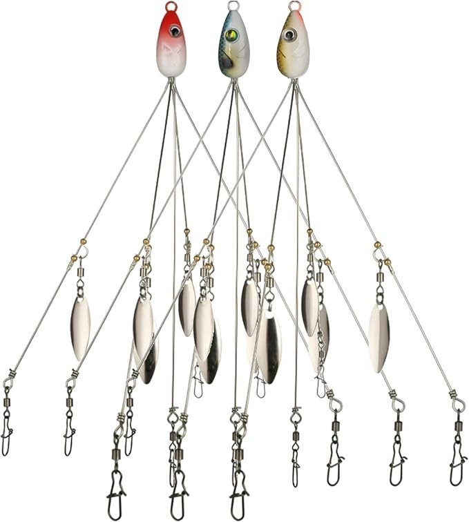 * 【Package Includes】: 1 Red, 1 Yellow and 1 Blue. Length: 21.5 cm (8.46 in); Weight: 17 g (0.6 oz). This Alabama rig allows anglers to cast multiple baits at once. It is the best partner for giant bass. * 【Well Made】: Made with high-quality swivel ring, the spoon can spin freely to catch bass over 10 lbs; smooth running ball bearings and clevis help the 4 bright shimmering willow leaves spin freely for more sparkle And vibrations attract target fish from a distance. * 【Suitable for Multiple Soft Baits】: 5 sturdy steel arms ensure strength and flexibility. Sinkerless product with blades. High-quality snaps and swivels allow for easy rigging with a variety of lures. * 【Widely Used】: Perfect for both saltwater and freshwater, no matter you are fishing in lake, river, sea, boat, this bait set will help you get great catch. * 【Target Fish】: Widely used for catching channel bass, striped bass, yellow perch, walleye, pike, muskfish, roach, largemouth or smallmouth trout, snook, salmon and more.