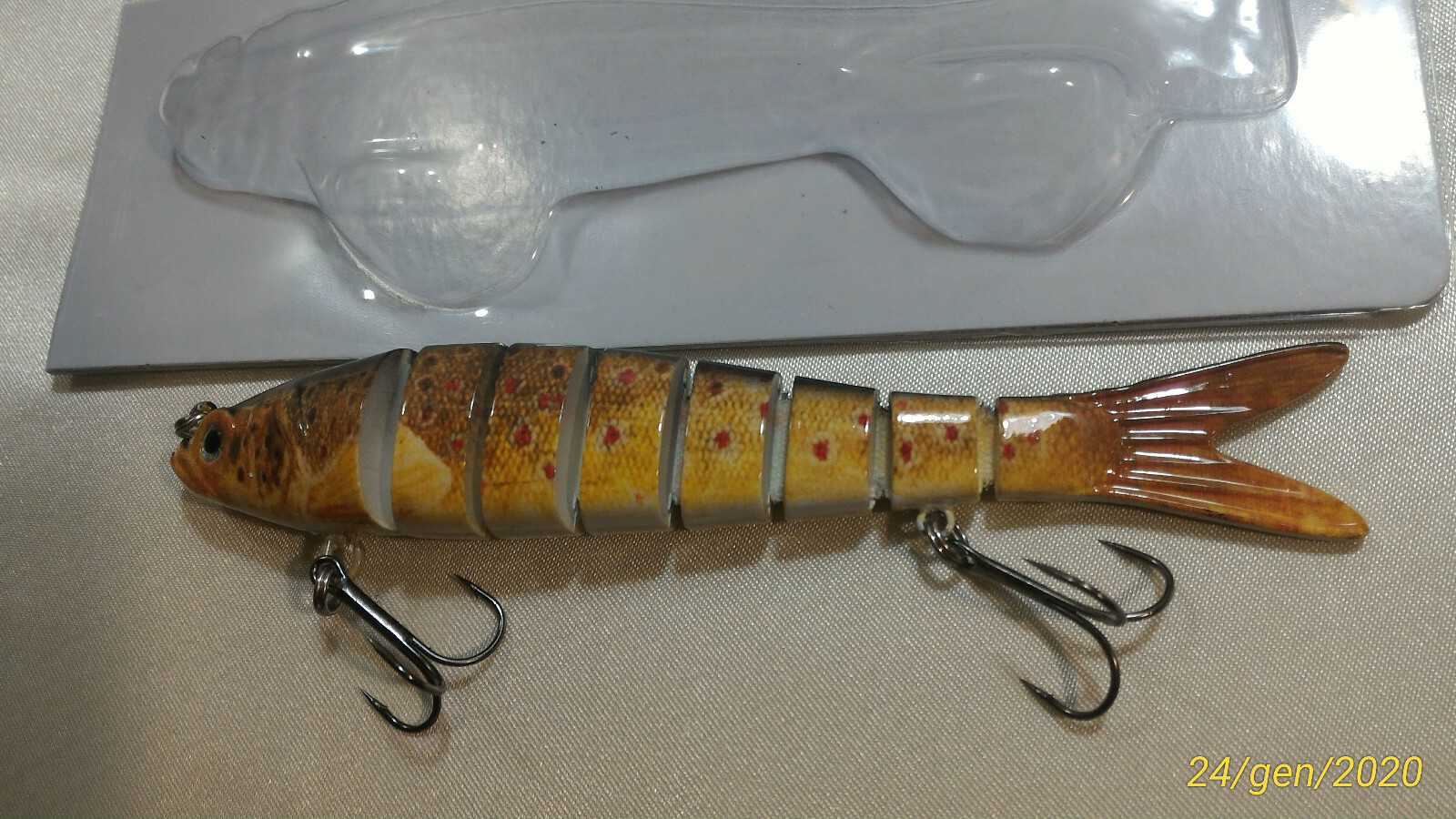 SPEDIZIONE IMMEDIATA - CONSEGNA IN 4/5 GIORNI. 10 SWIMBAIT DA PESCA A SPINNING TROTA LUCCIO BASS PERCA - PESCA IN MARE - 27 GR - 14 CM 10 Esche Artificiali da SPINNING per TROTA - LUCCIO - LUCCIO PERCA - PERSICO TROTA - PERSICI - PESCI DI MARE - Per il FIUME o il LAGO o il MARE TOP Gamma : 8 sezioni snodate. Caratteristiche: Durante la sua azione produce dei rumori interni di richiamo. Si muove come un pesce vero. 10 imitazioni del tipo "Trota" come in foto principale. 27 grammi - 14 centimetri. Imitazione scanzionata nella "livrea" poi riprodotta. Ottima anche per ogni tipo di PESCA IN MARE. (Lotto 1 - Mod 1 : "Trota".)