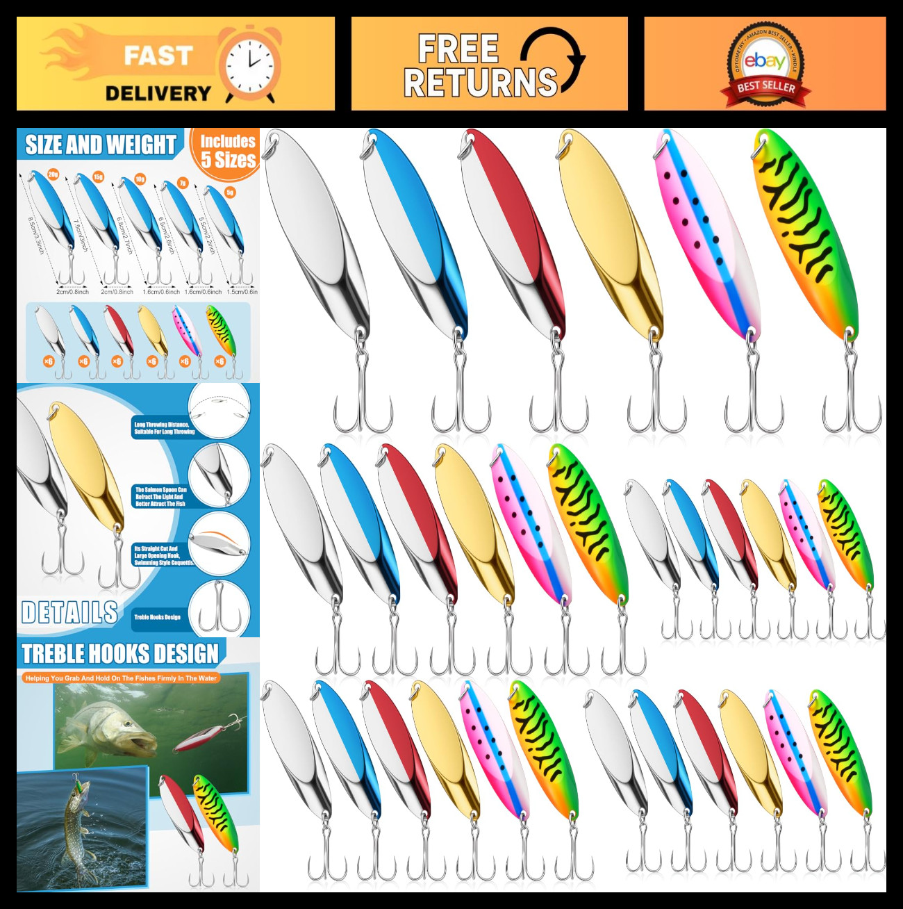 ULTIMATE FISHING LURE SET Elevate your fishing experience with this comprehensive fishing lure set, designed to attract a variety of fish species in both saltwater and freshwater environments. Perfect for anglers of all skill levels! KEY FEATURES: * Diverse Selection: Includes 6 unique styles and 5 different weights (5g, 7g, 10g, 15g, 20g) to cater to various fishing conditions. * Color Variety: Features 6 vibrant colors of fish spoon lures with a mirror flash surface for enhanced visibility. * High-Quality Material: Crafted from durable all-metal material with cutting-edge electroplating technology for improved underwater visibility. * Corrosion Resistant: Coating withstands harsh conditions and resists damage from fierce bites. * Trident Hook Design: Each lure is equipped with a reinforced sharp trident hook, perfect for catching larger fish such as trout, bluegill, pike, and bass. * Light Reflection: Effectively reflects light to attract fish from a distance, making it ideal for night fishing or low visibility situations. BENEFITS: * Versatile and effective for targeting bass, salmon, trout, and more. * Enhances your chances of a successful catch with its bright colors and reflective surfaces. * Sturdy construction ensures long-lasting use in various fishing environments. Upgrade your tackle box with this exceptional fishing lure set and enjoy an enhanced fishing adventure!