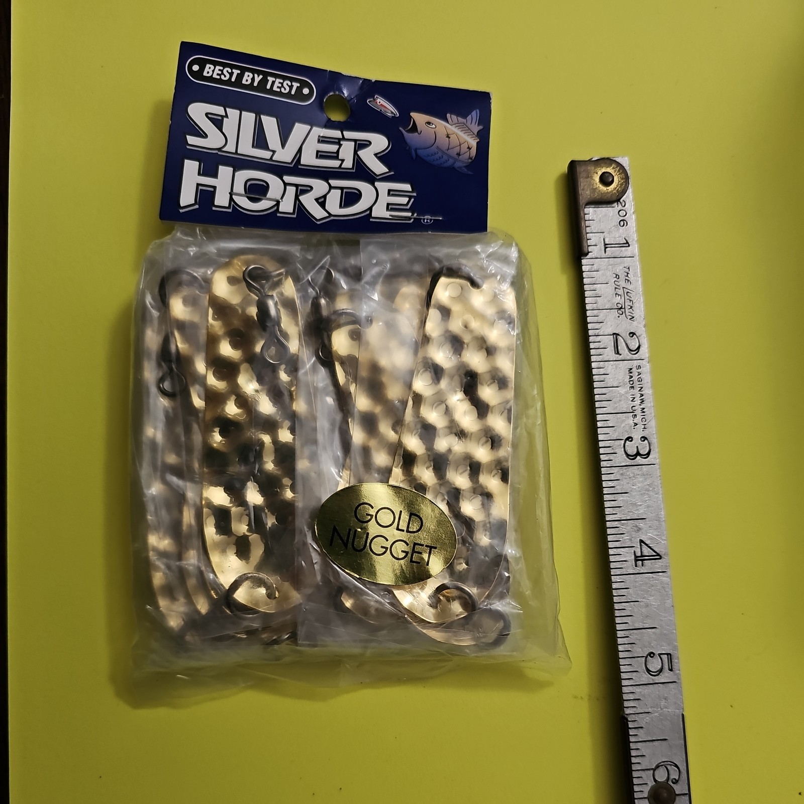 FREE SHIPPING. Silver Horde Best Bet #5 commercial trolling spoons. 12 in package. New. 4569 000 015 ALT# 4566 000 015 #5 Best Bet Hammered Gold Made in USA 12/PK 087321585997