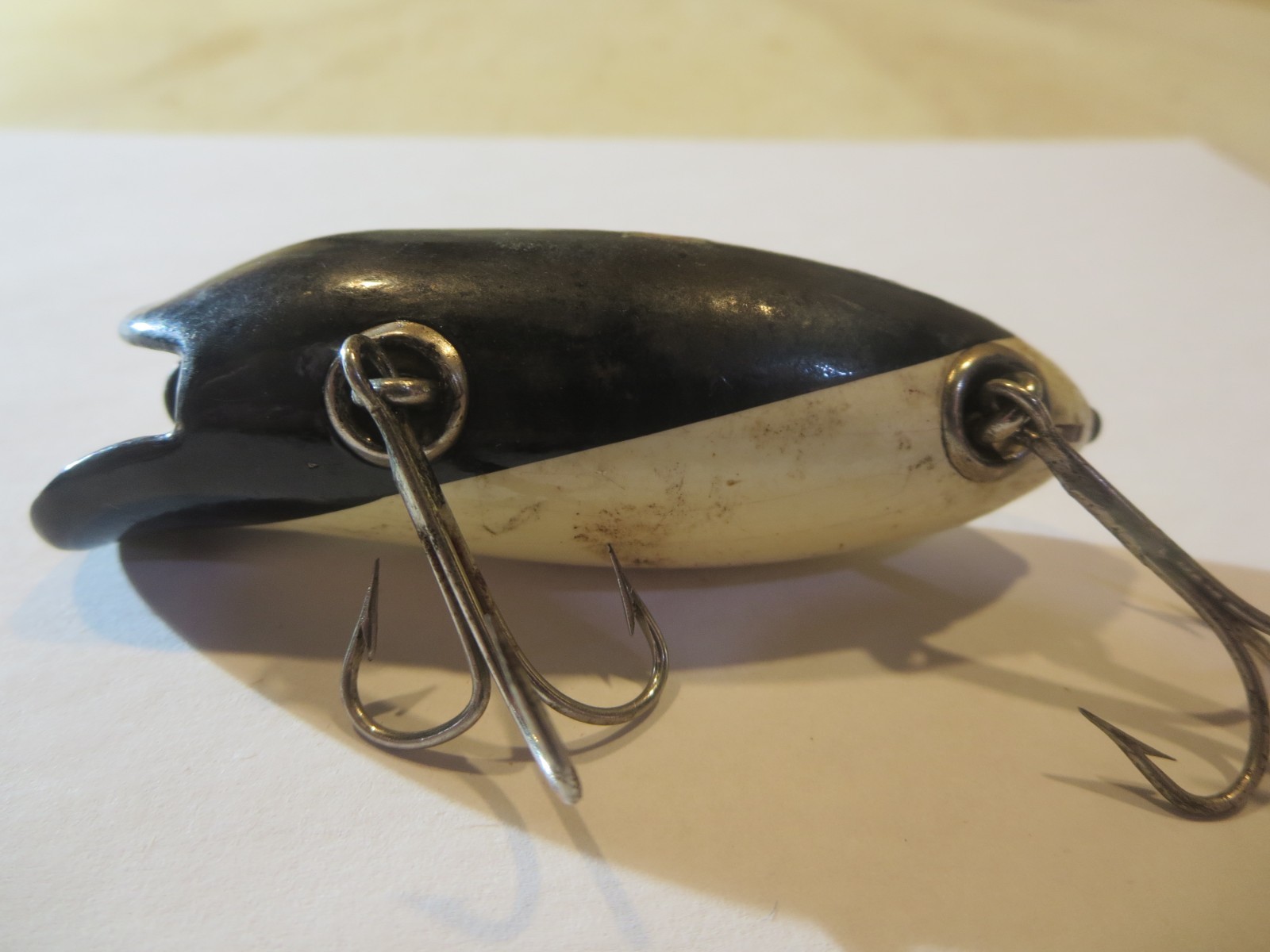 I am guessing this lure is very rare. I can't find another one for sale or much info. I sent pictures to 4 collectors and here are the responses i got. #1 I'm not sure. I wouldn't fish it. #2 I haven't seen this lure with a side hook or black & white color before. #3 Sometimes they made tester baits to see how they would run in the water. hook on the side generally indicates a type of wounded minnow. I think the bait would be desirable by a collector of Dunks- Carters. Establishing value is very difficult as it usually turns out to be what the particular collector will pay. #4 I Can't recall the name of the Carter's side hooker but it was a mate to the Bestevers from the 20's to early 30's. I was able to find the lure in a book by Carl F. Luckey called "Old Fishing Lures and Tackle #3. I also found it in a Hibbard,Spencer,Bartlett & Co. Catalog and inclued pictures in the listing. See the pictures for condition. It has a few stains and small chips. If you have any more info and want to make an offer please do.