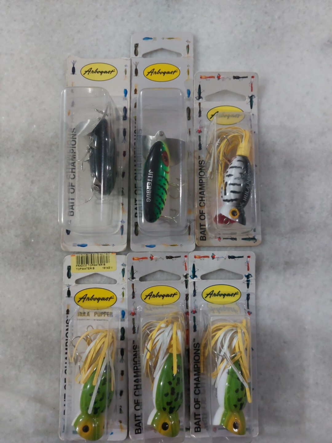 Lot Of 6 Arbogast Hula Poppers and jitterbug 2in 4 Colors. Condition is New. Shipped with USPS Ground Advantage.