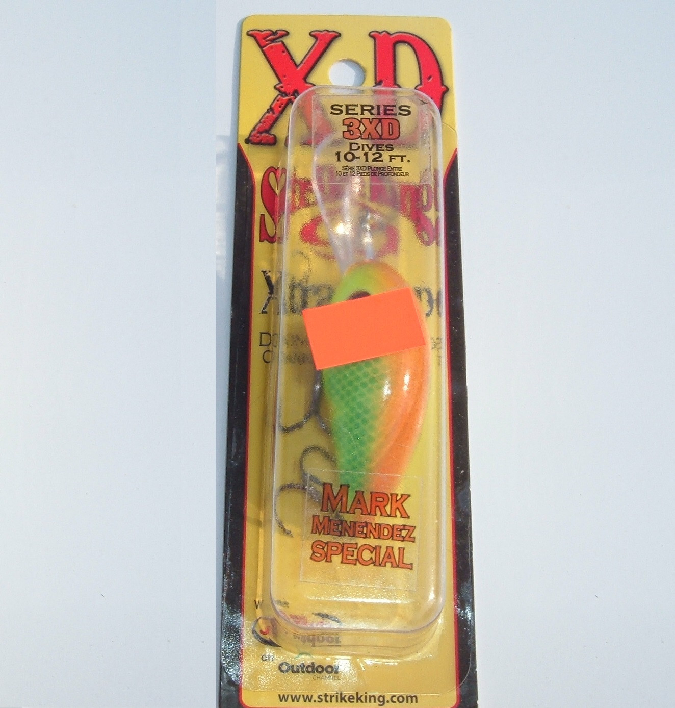 "3XD SPECIAL" BY STRIKE KING ---------------------------------------- SERIES/SIZE: HC3XD COLOR: PINEAPPLE SMASH - MARK MENENDEZ SPECIAL (MM1) LENGTH: 2 INCHES WEIGHT: 7/16 OZ. DIVING DEPTH: 10 TO 12 FEET ---------------------------------------- ---------------------------------------- Item Comment: Deep diving crankbaits are common, but the unique curved bills of the XD series allow the bait to dive deeper and faster changing the deep diving crankbait game forever. The XD series from Strike King has set the standard for deep running crankbaits! The Strike King Pro Model 3XD Crankbait is a smaller bodied version of the popular XD series crankbaits. Designed to get down extra deep, it’s smaller profile is perfect for those times when bass are chasing smaller forage or just won’t commit to bigger baits. Please refer to all attached pictures for a photographic description and close-up details. * Lifelike eyes * Ultra sharp hooks * Free-floating rattle chambers * Emit varying sound frequencies * Dives 10'+ ---------------------------------------- My feedback speaks for itself so BID WITH CONFIDENCE!!! Payment is to be made within 3 days from the close of the listing. NOTE: This listing is open to buyers/bidders with a shipping address in the USA. Additionally, bids by known exporting companies will be cancelled and their username will be placed on my block list per Ebay rules (sorry, no exceptions!). Shipping & Handling See Listing. I ship in boxes not padded mailers unless noted. I believe your merchandise should arrive in the same condition as when it was shipped. I only ship to the address provided by Ebay, NO EXCEPTIONS! Insurance is the responsibility of the buyer! Insurance may be requested by the buyer at additional cost above the posted shipping & handling charge. RETURNS: My listings are thoroughly described with text and photos so the buyer knows what they are purchasing, therefore, returns will only be accepted if the item is not as described. Please contact me directly with any issues you may have with your purchase. Feedback: Please leave 5-star feedback if you are pleased with your purchase and I will certainly return the favor. If you have any dissatisfaction with your purchase, please contact me before leaving neutral or negative feedback. Please check out my other listings by clicking on the “See other items” link at the top of the page located under my user name. If you have questions about this listing or would like additional photos, drop me a line and I will get back to you as soon as humanly possible! THANKS FOR LOOKING! & TAKE A KID FISHING!