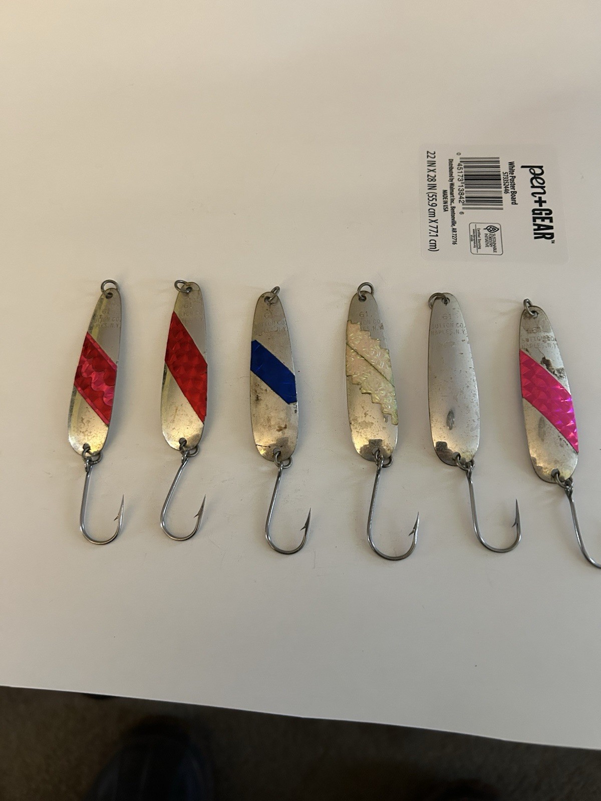 Lot of 6 Sutton flutter style spoons smooth silver/silver with tape. Some have scratches still all good fishing spoons. Priced accordingly No returns USA only I sell mostly used items please donโt expect perfect unless stated. I have a lit of Salmon Steelhead stuff to list. A lot of it is discontinued vintage very desirable. Please put me in your favorites Thanks