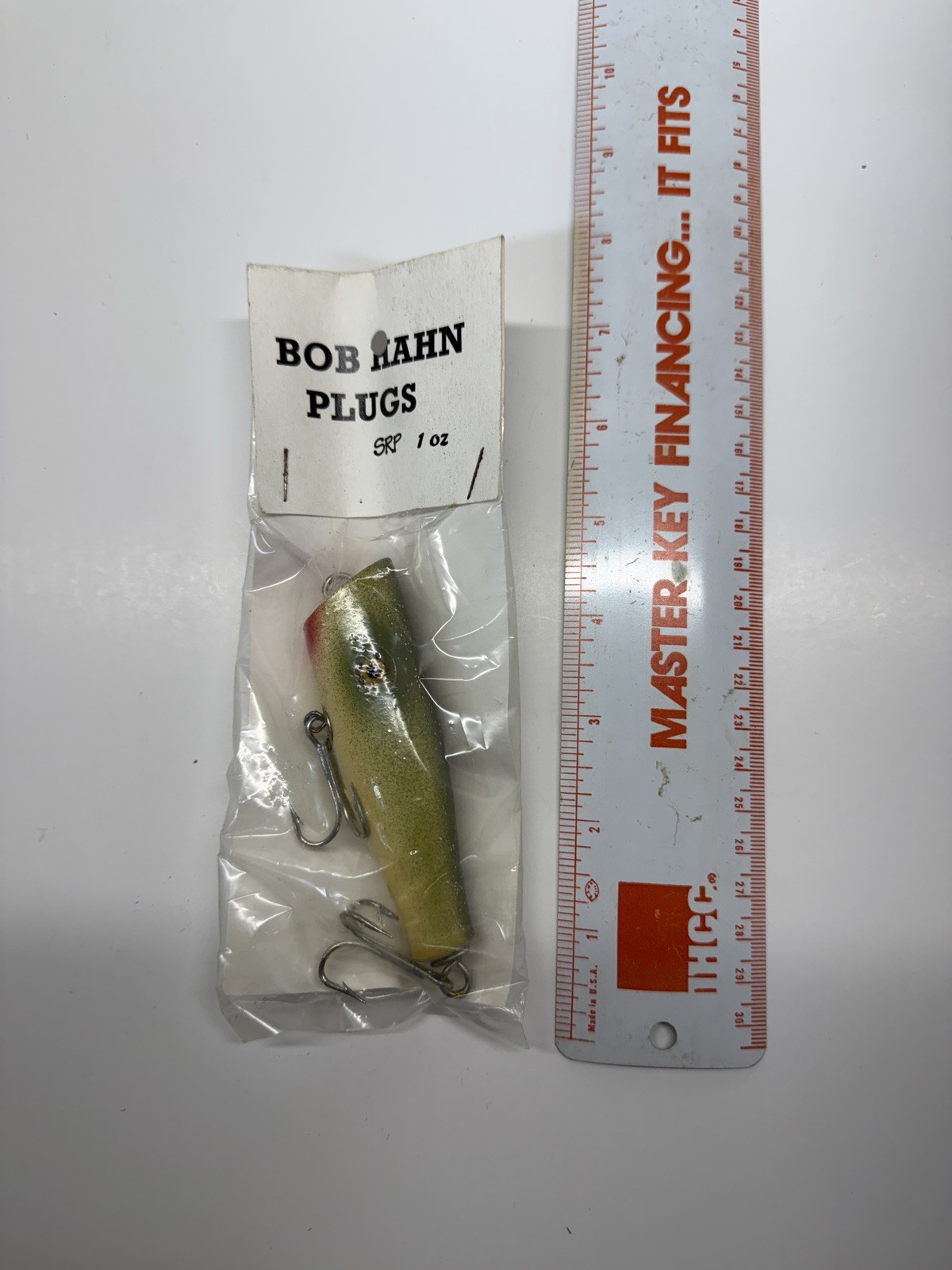 Up for sale is a vintage Bob Hahn wooden fishing plug/lure. This lure is the SRP 1oz model, this lure is designed for saltwater fishing, it includes through-wire construction. Color is olive/cream, but please review photos as the package does not state the color. Lure is new in package with typical wear/tear from display, hooks pushing through plastic bag. The ruler included in the photo is shown for scale/reference only and is not included in the sale. Please review all photos and request additional photos if needed. This item is being sold as is.