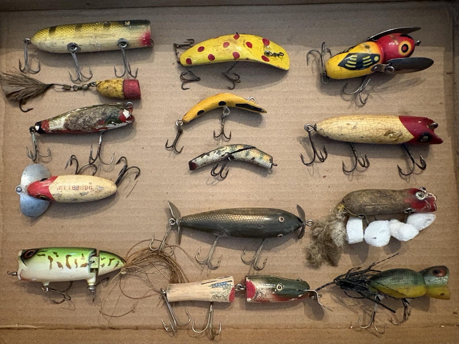 Collection of 31 vintage fishing lures some maybe antique? Heddon, Paw Paw, Johnsonβs, Helinβs, Luhr-Jenson, and possibly a Montpelier Bait Company. All in different conditions ranging from never used in original packaging, to missing hooks or some damage. All of them have beautiful patina. Selling as collectors pieces only. Please refer to pictures for more details. Feel free to ask any questions related to this item. Selling As Is