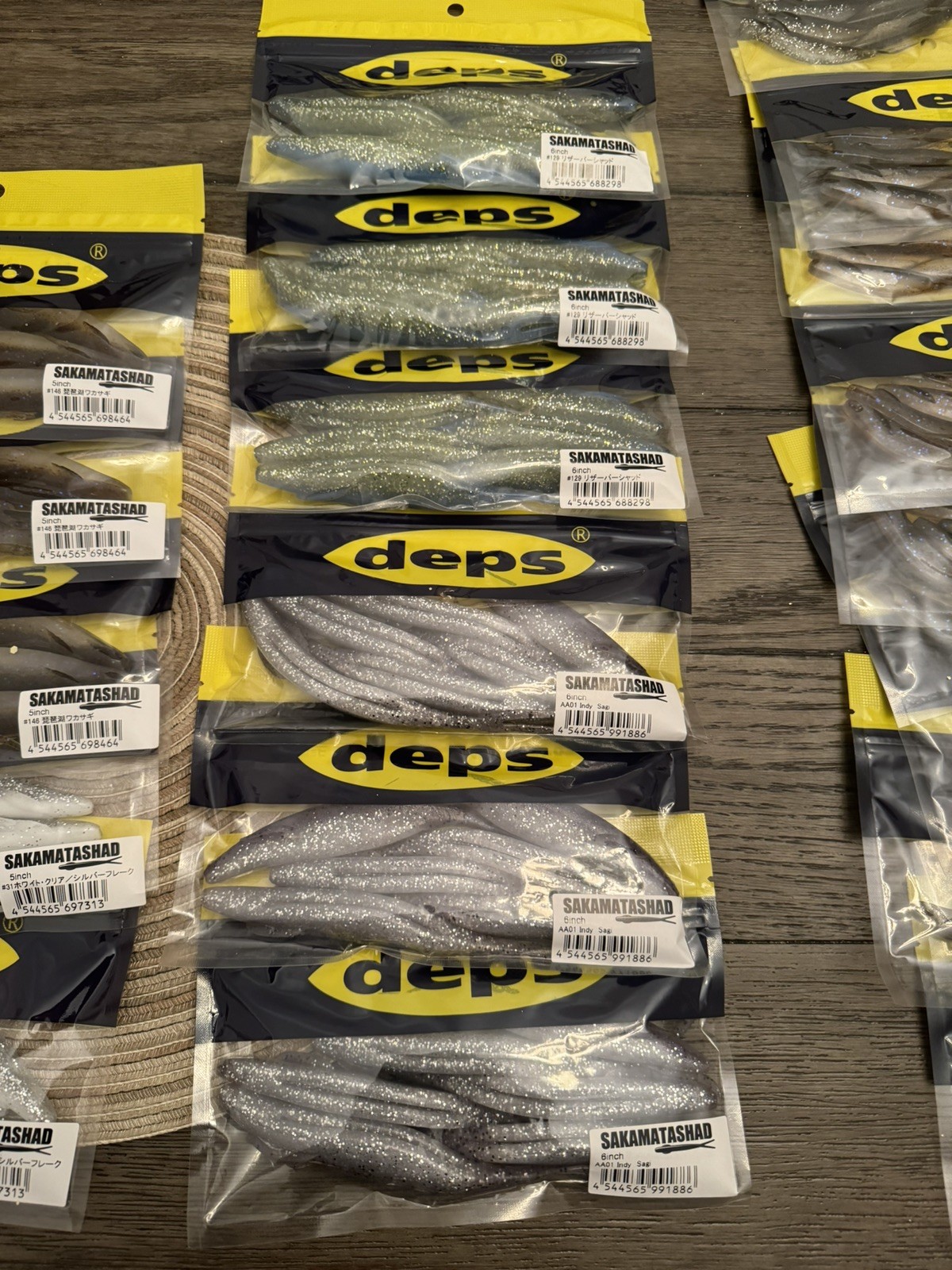 Deps Sakamata Shad Lot of 30 bags for sale 19 - 4 inch : 7 silver shiner, 6 indy Sagi, 6 biwako Wakasagi 5- 5 inch : 3 biwako wakasagi, 2 white clear silver flake 6 - 6 inch :3 reservoir shad, 3 indy sagi, 30 bags
