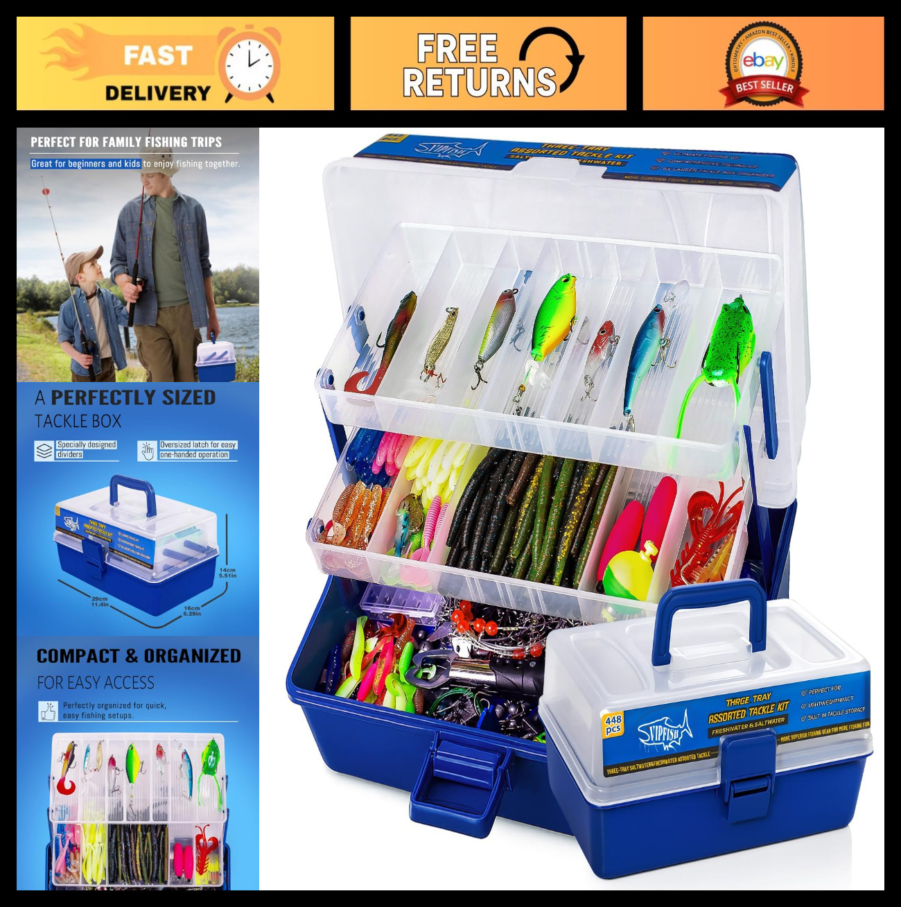 TACKLE BOX WITH TACKLE INCLUDED - 448-PCS FISHING KIT Everything you need for an unforgettable fishing experience is included in this premium kit. With 448 essential pieces in a bait and tackle box, you'll have a full set of lures, hooks, weights, pliers, rigs, and accessories to tackle any fishing adventure with confidence. DURABLE 3-LAYER BAIT AND TACKLE BOX FOR EASY ORGANIZATION Stay organized and efficient with the included 3-layer tackle box. Designed for durability and convenience, it keeps your fishing gear neatly arranged, ensuring you can quickly grab exactly what you need when you're out on the water. TOP-QUALITY FISHING ACCESSORIES FOR EVERY ANGLER Crafted from premium materials, the kit includes: * High-performance fishing hooks * Pliers * Bobbers * Weights * Rigs * Leaders This selection is perfect for both freshwater and saltwater fishing, ensuring reliability and durability every time you cast your line. VERSATILE FOR ALL TYPES OF FISHING Whether you're fishing from a boat, pier, or shore, this versatile set has all the essentials to make your trip a success. Ideal for catching bass, trout, and more, itβs designed to perform in both freshwater and saltwater environments. PREMIUM FLUOROCARBON FISHING LINE This kit includes high-performance fluorocarbon line, known for its superior strength, invisibility underwater, and resistance to abrasion. Ideal for both freshwater and saltwater fishing, this line ensures a reliable, high-quality connection to your catch. THE PERFECT GIFT FOR FISHING ENTHUSIASTS Looking for a thoughtful gift for the angler in your life? This complete fishing kit makes an ideal present for birthdays, holidays, or any special occasion. Itβs a perfect way