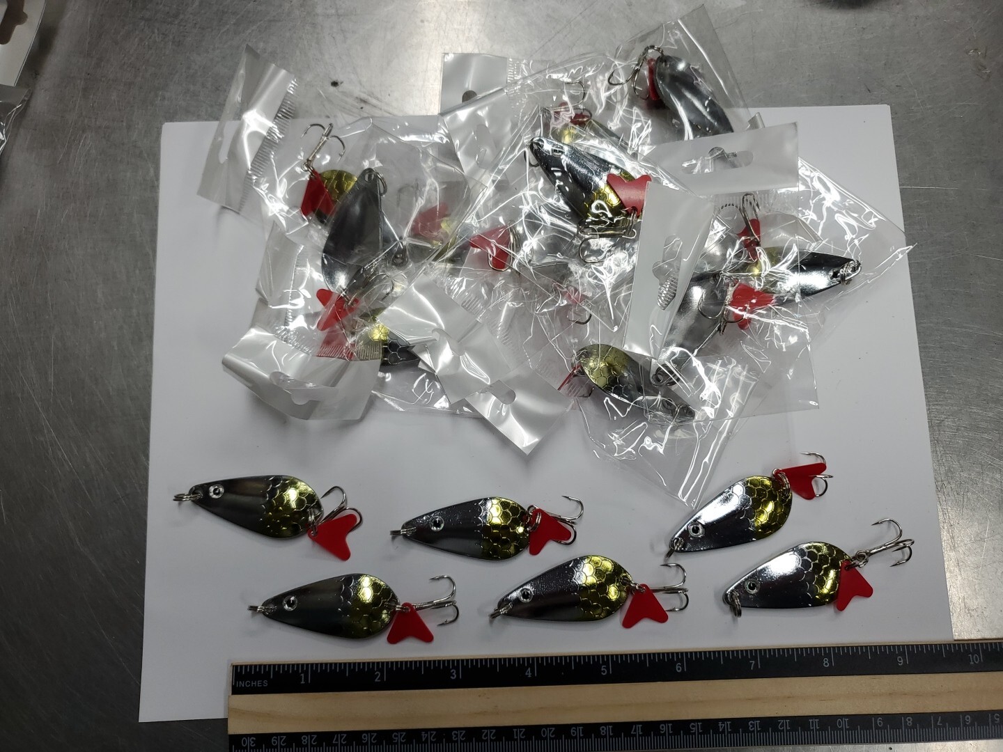 This is a lot of 60 brand new flash spoons by Big River Tackle. It weighs 3/8 oz. and measures approx. 2.5 inches long. It is the "Silver & Gold" color. Sharp stainless steel treble hook with red plastic flag. Glued on 3D eye for realism. Strong split ring for line tie. Lure will be shipped in its own individual clear plastic packaging (removed from packaging for photos for listing). The lot of 60 will come in a sealed small cardboard box. The photo doesn't show all 60 spoons but you will receive 60. We carry a wide array of fishing gear and will combine shipping on all items ordered from our page! (C2;#12)