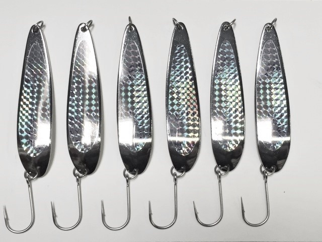 6- NEW 7 OZ. CHROME CROCODILE "TWISTER" SPOONS W/HOLOGRAPHIC REFLECTIVE PRISM TAPE AND STAINLESS STEEL SIWASH HOOKS. THE STRIPER AND BLUEFISH KILLER SPOON A versatile spoon that will catch any fish attracted to a flashing wobbling meal. The narrow shape and heavyweight design creates a bold combination of thumping vibration and flashing attraction. 7/0 Stainless Steel Siwash Hooks
