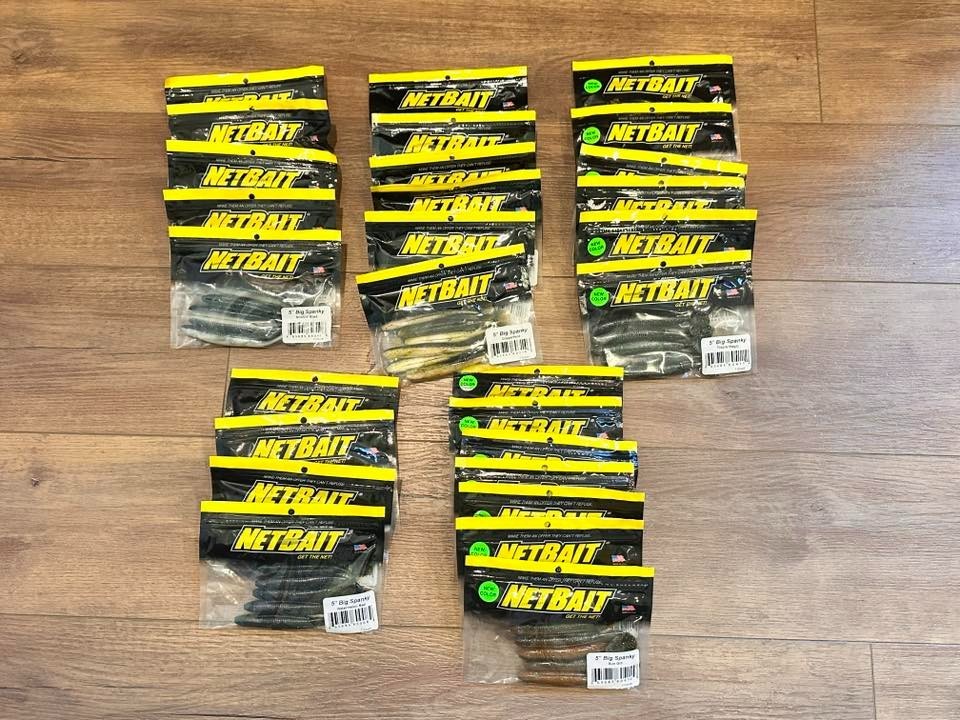 Netbait 5" Big Spanky Swimbaits 28 bags total Colors Sungill: 7 bags Tilapia Magic: 6 bags Watermelon Red: 4 bags Copperfield: 6 bags Smokin Shad: 5 bags One bag of of Tilapia Magic only has 6 baits.