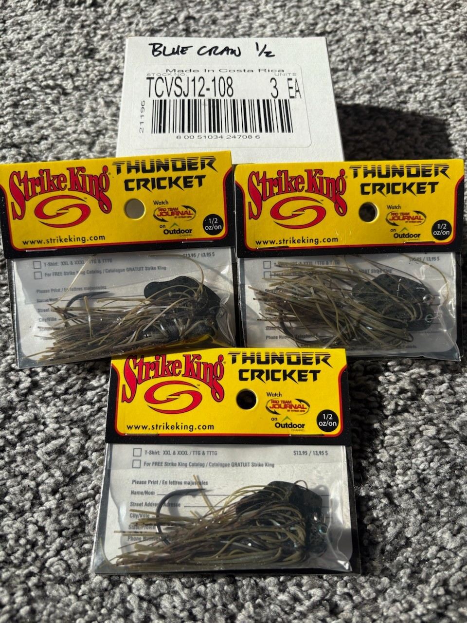 WELCOME TO BRODY Of The LAKE. AS ALWAYS LOW START BID & NO RESERVE.ย 3 New in the Pack STRIKE KING FISHING LURES 1/2oz THUNDER CRICKET Chatter Bait SWIM JIG Lot Bundle 3 Pack JIGS Baits Lures. Size 3ct x 1/2oz Color: TCVSJ12-108 BLUE CRAW Retails for $13 Each a $40 VALUE with Tax. FREE USPS Mail shipping with Delivery confirmation in the Continental U.S., ,International Flat Rate Priority Shipping is $38. overseas and $28 to Canada/Mexico. WE OFFER DISCOUNTED SHIPPING TO MULTY AUCTION WINNERS... Successful bidder to email within 3 days and payment to be received within 5 days of auction end. GOOD LUCK! Check Out My Other Rare Treat's And Save On Combined Shipping! LOCATE! CATCH and WIN AT Brodyofthelake AND..if your looking for more amazing deals on fishing tackle and cool outdoor items, please check out "byronsbunker" on Ebay!!