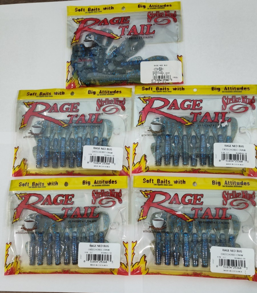 Lot of 5 pks 9 per pack. Rage Ned Bug Color - Okeechobee Craw The Rage Tail? lure?s unique and exclusive tail design is engineered like no other soft plastic bait. Each is designed with a specific purpose and uses customized hi-grade plastics for superior action. You won't believe the splash, noise or action is coming from a soft plastic...but the fish will.