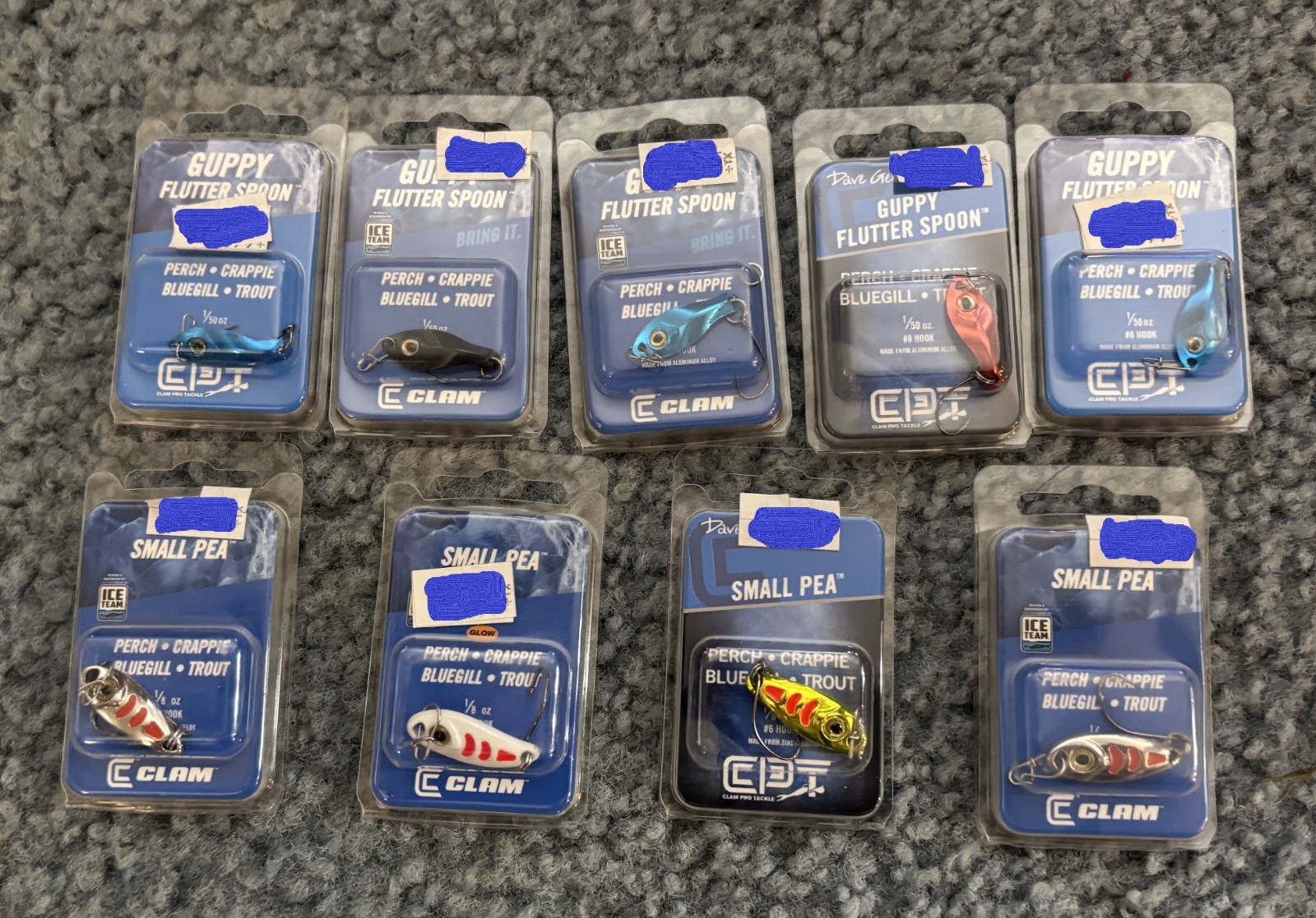 This is a lot of 9 packs Clam and CPT ice fishing lures, flutter spoons and small peas. You receivie exactly what is shown in photo.