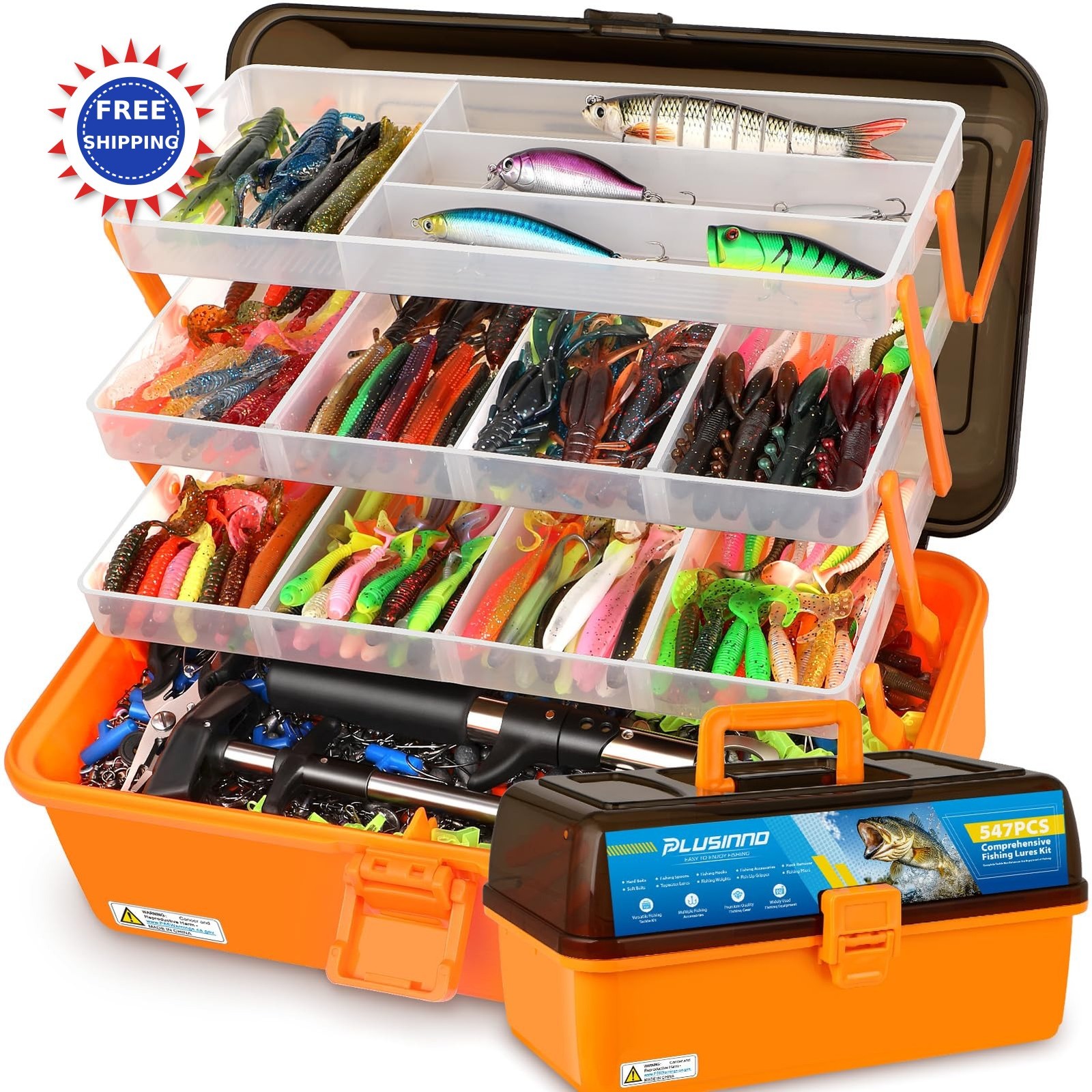PLUSINNO LARGE 4-LAYER TACKLE BOX WITH TACKLE INCLUDED, 547PCS FISHING LURES KIT - PLIERS, CRANKBAIT, HOOKS, WEIGHTS & ACCESSORIES - FRESHWATER BASS FISHING BAIT LURE GEAR AND EQUIPMENT, GIFT FOR MEN * 12X Spacious 4-Layer Tackle Box with Tackle Included - PLUSINNO 4 layers tackle box boasts a spacious 14.5X8.3X8.1 inch capacity, with 12X the capacity of standard tackle boxes, offering ample storage. The removable grid panels create adjustable compartments for fishing lures, while open zones fit bulkier gear. Customize layouts in seconds, keep essentials handy, and carry effortlessly with the ergonomic handle. Ideal for lakeside trips or gifting anglers who crave clutter-free efficiency * Ultimate All-In-One Fishing Gear This complete fishing kit has everything you need pliers, fish gripper, hook remover, 544 premium fishing accessories (62 soft lures, 146 hooks, 11 jigs etc ), upgrade to build 16 pro rig combos like Texas/Carolina/Drop Shot 50% more setups than standard fishing tackle! No extra purchases, no wasted prep time. Organize once, fish all day with battle-ready multi-segment swimbait, crankbaits, and 87 sinkers. Hassle-free prep for spontaneous trips * 2025 Upgraded Ultra-Durable Fishing Tackle Box - Engineered with high-density ABS resin and an impact-resistant structural design, this tackle box delivers dual-layer protection against intense impacts and abrasive wear. The newly upgraded Hinge-Actuated Latch, enables instant one-handed opening/closing while maintaining the initial biting precision after 10,000+ cycle tests. Built to withstand decades of rigorous use, truly realizing the reliable promise of one box with fishing for life * Exceptional Fishing Tackle Kit - Includes 4 lifelike lures (Swimbait, Popper, Crankbait, Minnow) with 3D realistic looking eyes and pearl powder coating for ultra-realistic underwater appeal. The 8-segment articulated design achieves slow-sinking action and move flexible that the lifelike swimming action, proven to attract predator fish like bass and trout. Pair it with stainless steel fishing gear such as pliers and fish controllers to make every freshwater fishing trip a full one! * Ultimate Fishing Gift for Men - The PLUSINNO tackle box kit offers a stylish, comprehensive fishing equipment perfect for anglers of all levels. This high-value gift is ideal for holidays like Father's Day, Christmas, Thanksgiving, and birthdays. Designed to impress husbands, fathers, and brothers, its thoughtful construction and complete set of fishing tools ensure an exceptional experience for both beginners and seasoned fishing enthusiasts. โ Free shipping ยท Ships within 2 business days โ 30-day free returns โ Questions? Message us anytime