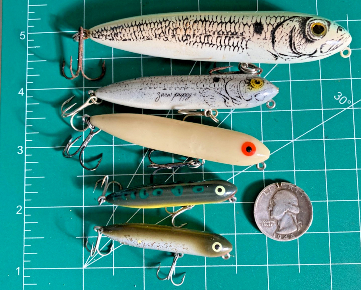 HOOKED-ON-VINTAGE IS SO PLEASED TO OFFER THIS RARE LOT OF 5 HEDDON TOPWATER LURES / SURFACE CRANKBAITS. LOT 5 TOPWATER LURES HEDDON ZARA POUCH ZARA PUPPY SURFACE CRANKBAITS BONE SPOOK. SORRY THE U.S. QUARTER IS NOT INCLUDED WITH THIS LOT OF TOPWATER FISHING LURES AS SHOWN IN THE PHOTOS, SOLD AS SHOWN IN THE SUPER-SIZE PHOTOS. I HAVE OTHER GREAT VINTAGE FISHING GEAR FOR SALE ON EBAY CURRENTLY, AND WE LOVE TO COMBINED THE SHIPPING TO SAVE YOU MONEY AND ALLOW YOU TO GET ALL THAT YOU WANT FOR YOUR COLLECTIONS, OR FOR GIFT GIVING. SOLD AS IS, AND AS SHOWN IN THE SUPER-SIZED PHOTOS. Please email us with any questions! Thank you for looking!